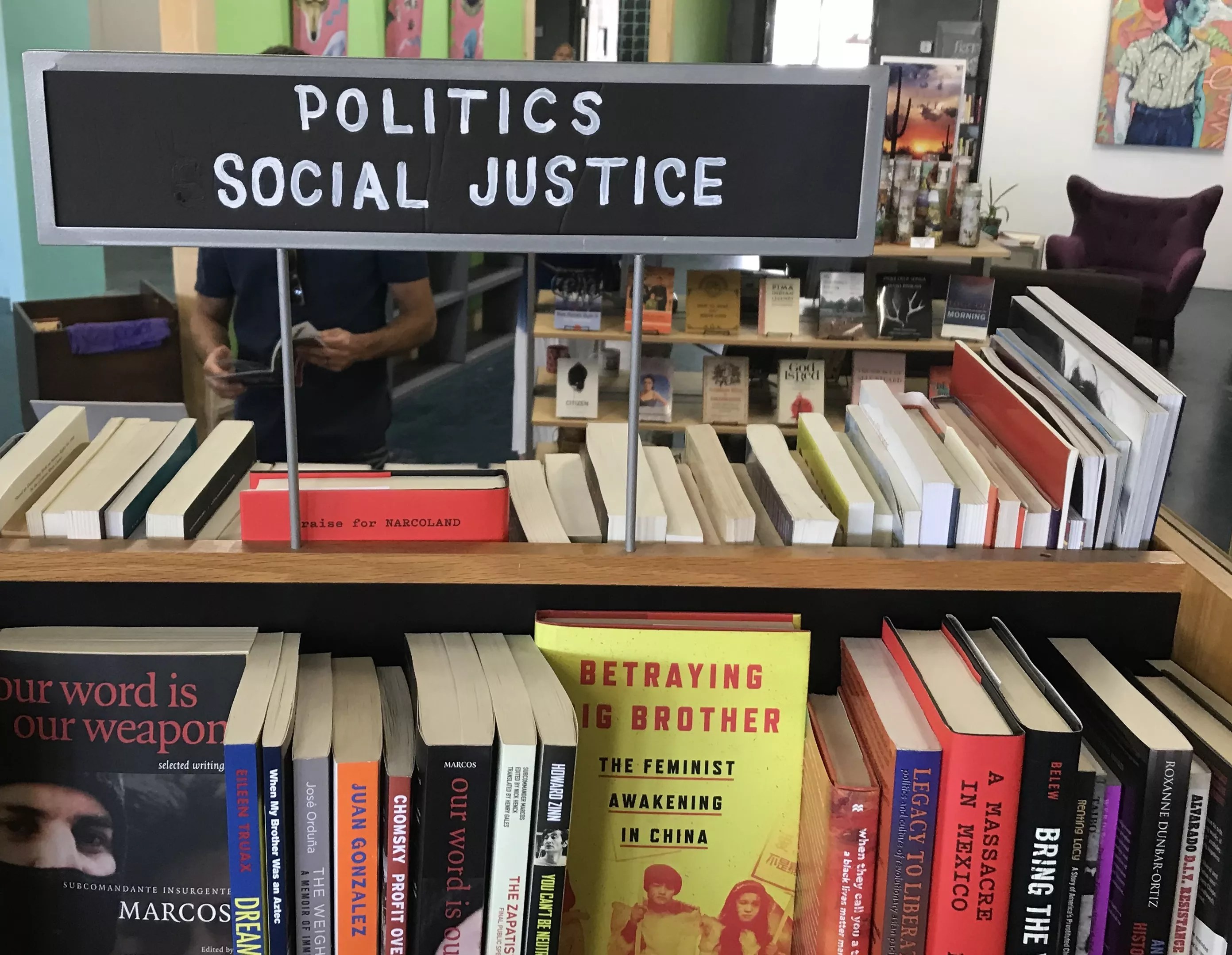 Checking out the social justice section at Palabras Bilingual Bookstore.
