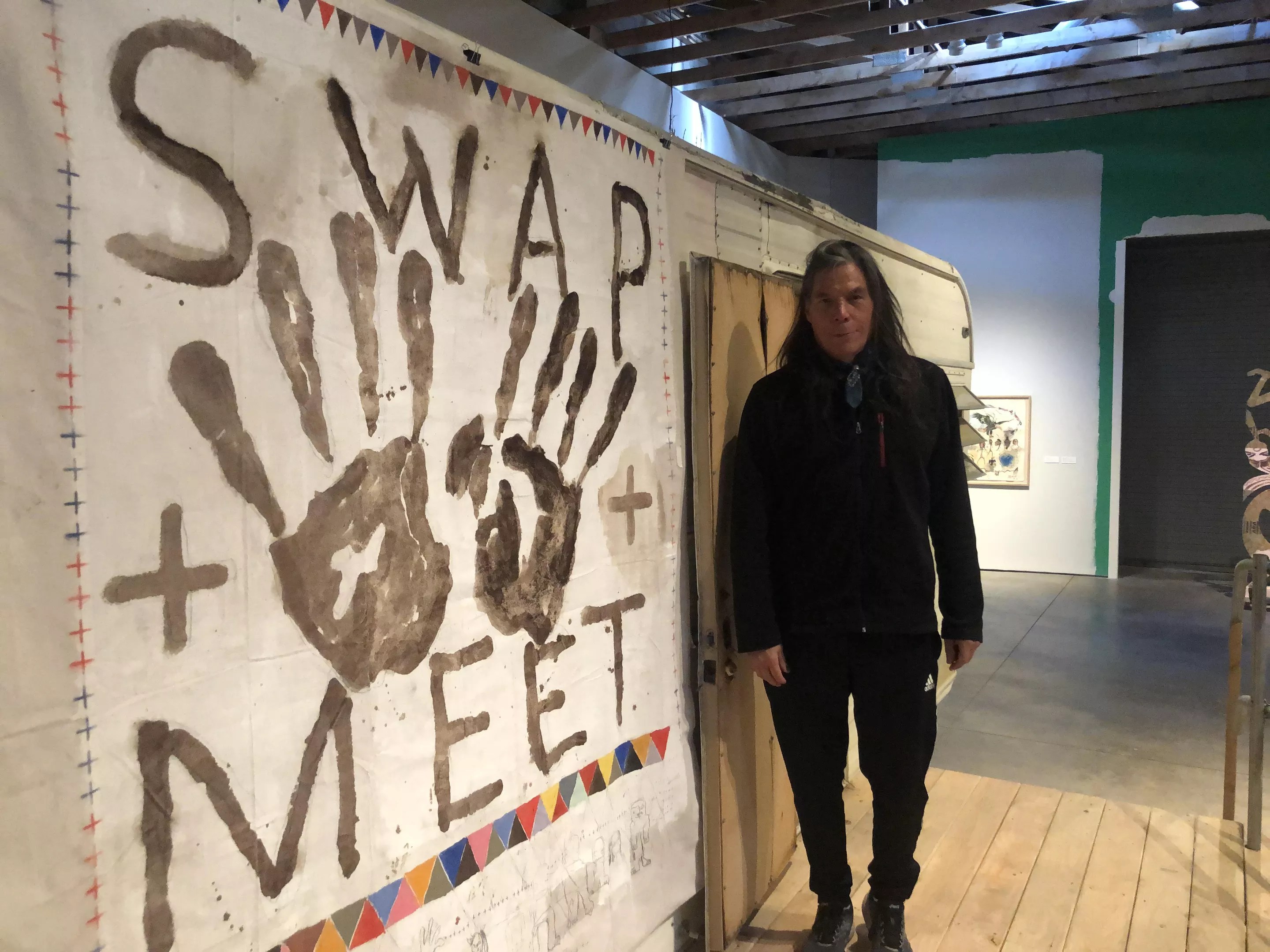 Artist Brad Kahlhamer stands with the centerpiece of his “Swap Meet” exhibition. Jennifer Goldberg