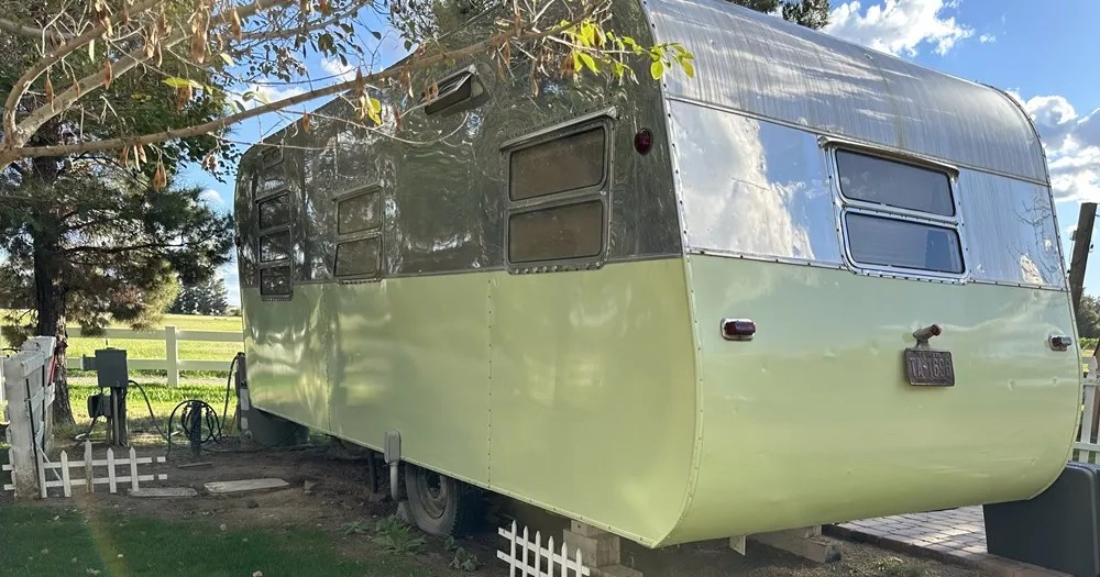 A 1953 Westwood Caravan is one of the trailers you can stay in at The Cozy Peach at Schnepf Farms.