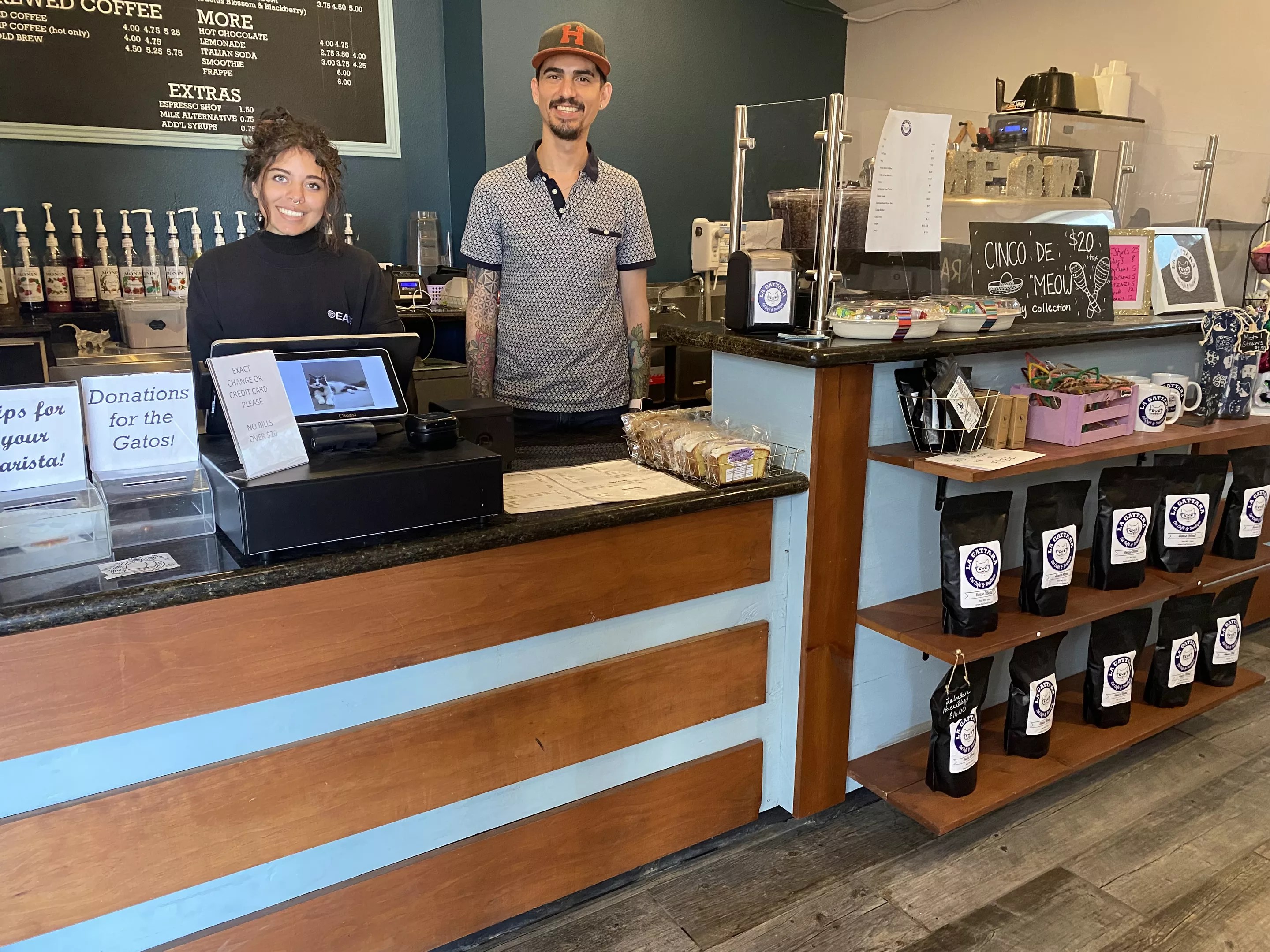“Purrista” Hope Orozco and manager Miguel Andrade welcome visitors to La Gattara Cat Cafe.