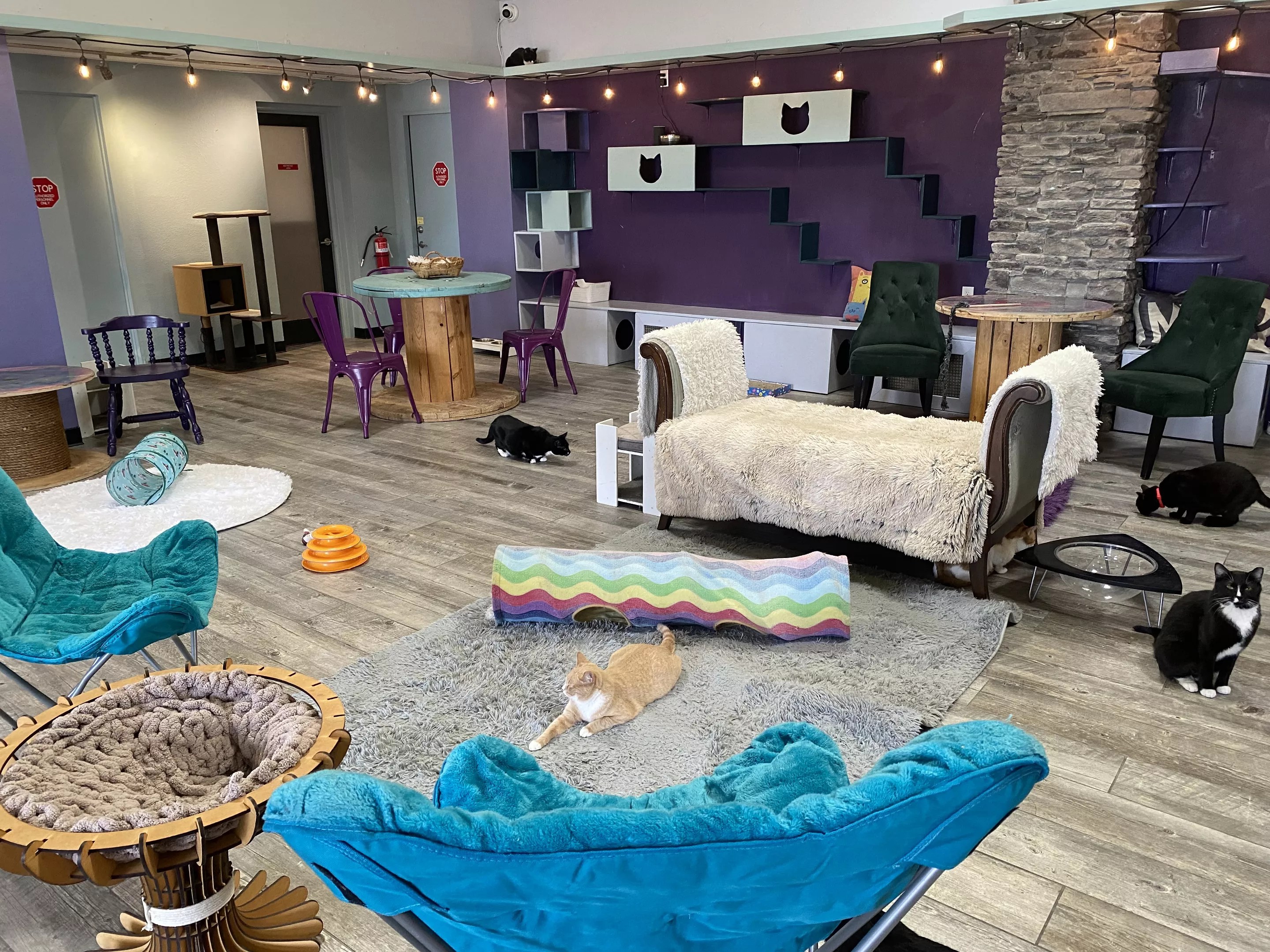 Upon entering, there’s a room with a coffee and tea bar and a small boutique, and to the left is a large, open playroom that holds about 25 cats at any given time. They’re separated by a vestibule with doors on each side to prevent escapees.