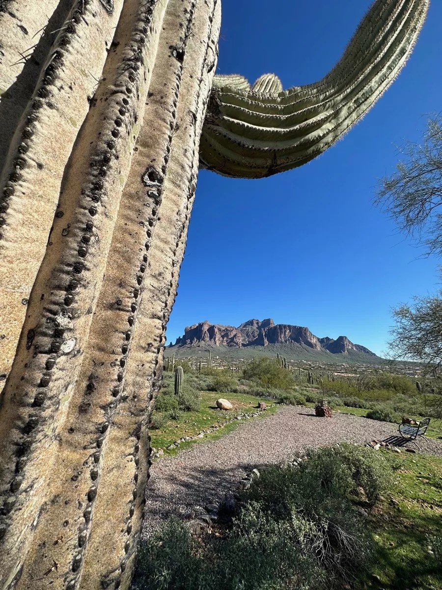 Saguaro on the nature trail stand under the watchful eye of Superstition Mountain.