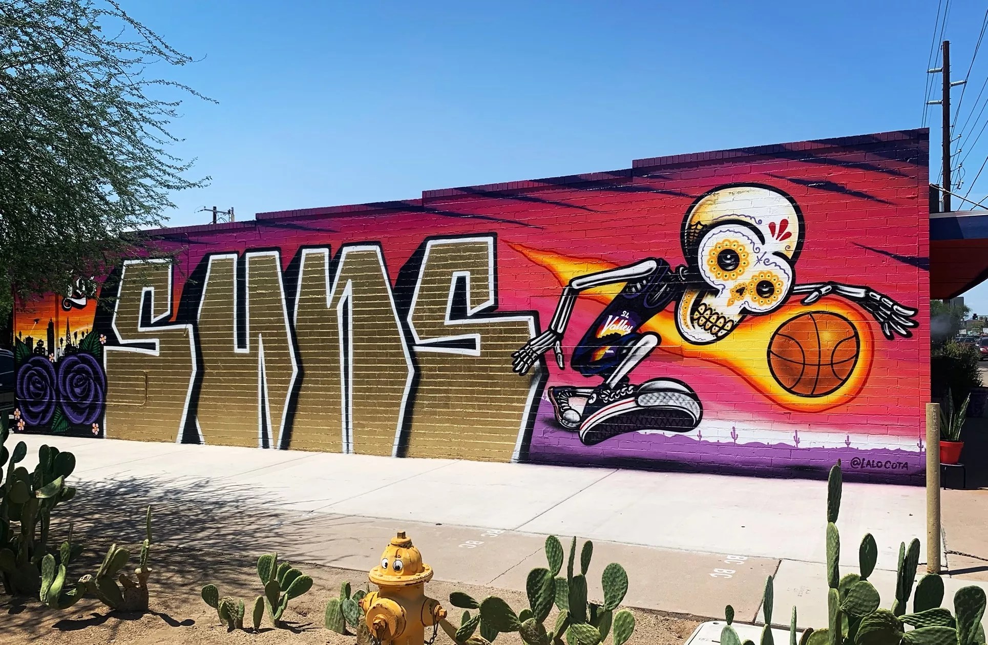 When Phoenix unveiled their alternate “Los Suns” uniforms in November 2019, the team also collaborated with local painter Lalo Cota to create a mural for the occasion. The local artist adorned an exterior wall of Carly’s Bistro on Roosevelt Row with a 10-foot-high rendition of Devin Booker as a stylized skeleton, one of Cato’s signature motifs, in honor of the star’s Mexican-American heritage. Last week, Cota created another Los Suns mural on the Calle 16 building at 16th Street and Windsor Avenue, featuring a Día de los Muertos-style skeleton (or calaca) clad in “Valley” city uniform and dribbling a flaming basketball. It’s already gotten plenty of love on social media.