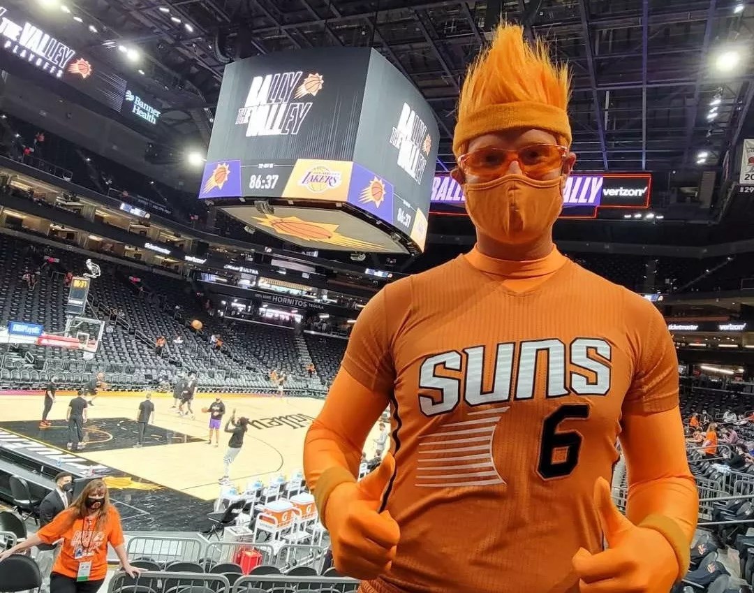 Battillo, a season ticket holder for 16 years, has been coming to games as the character since the Suns last made the NBA playoffs in 2010. (He’s also made appearances at local hospitals, charity events, pep assemblies, and retirement communities.) Battillo’s also shown up at road games during the Phoenix’s current postseason run and even got a fist-bump and shoutout from Devin Booker after the team eliminated the Los Angeles Clippers in the Western Conference Finals.