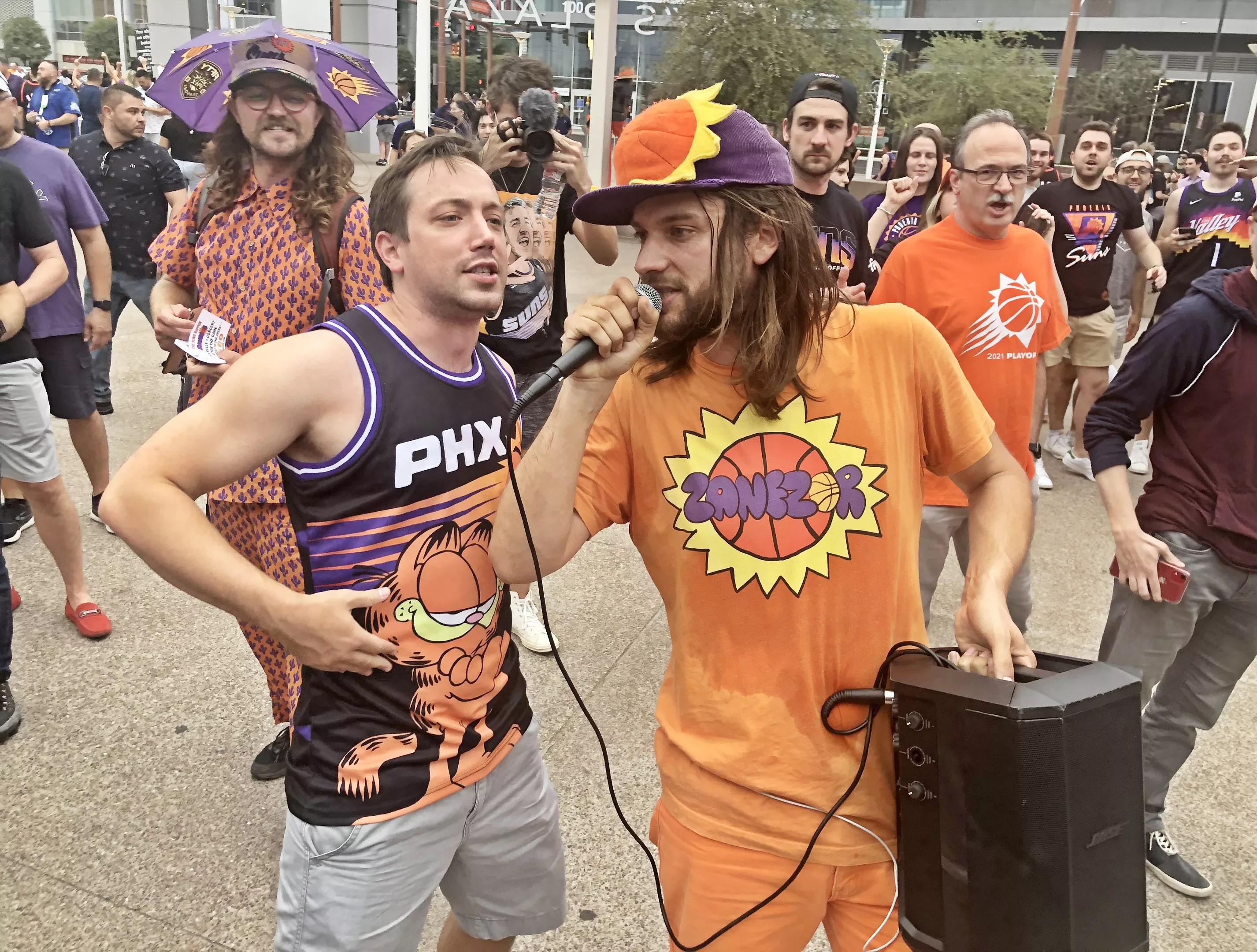 Zanezor’s Suns-themed raps might not get blasted from the sound system inside Footprint Center, but you can definitely hear them at every home game. The local artist, self-described as the “Official Unofficial Suns Rapper,” roams the arena’s outdoor plaza with a microphone and portable amplifier as fans roll up, spitting bars inspired by the team for anyone within earshot.
