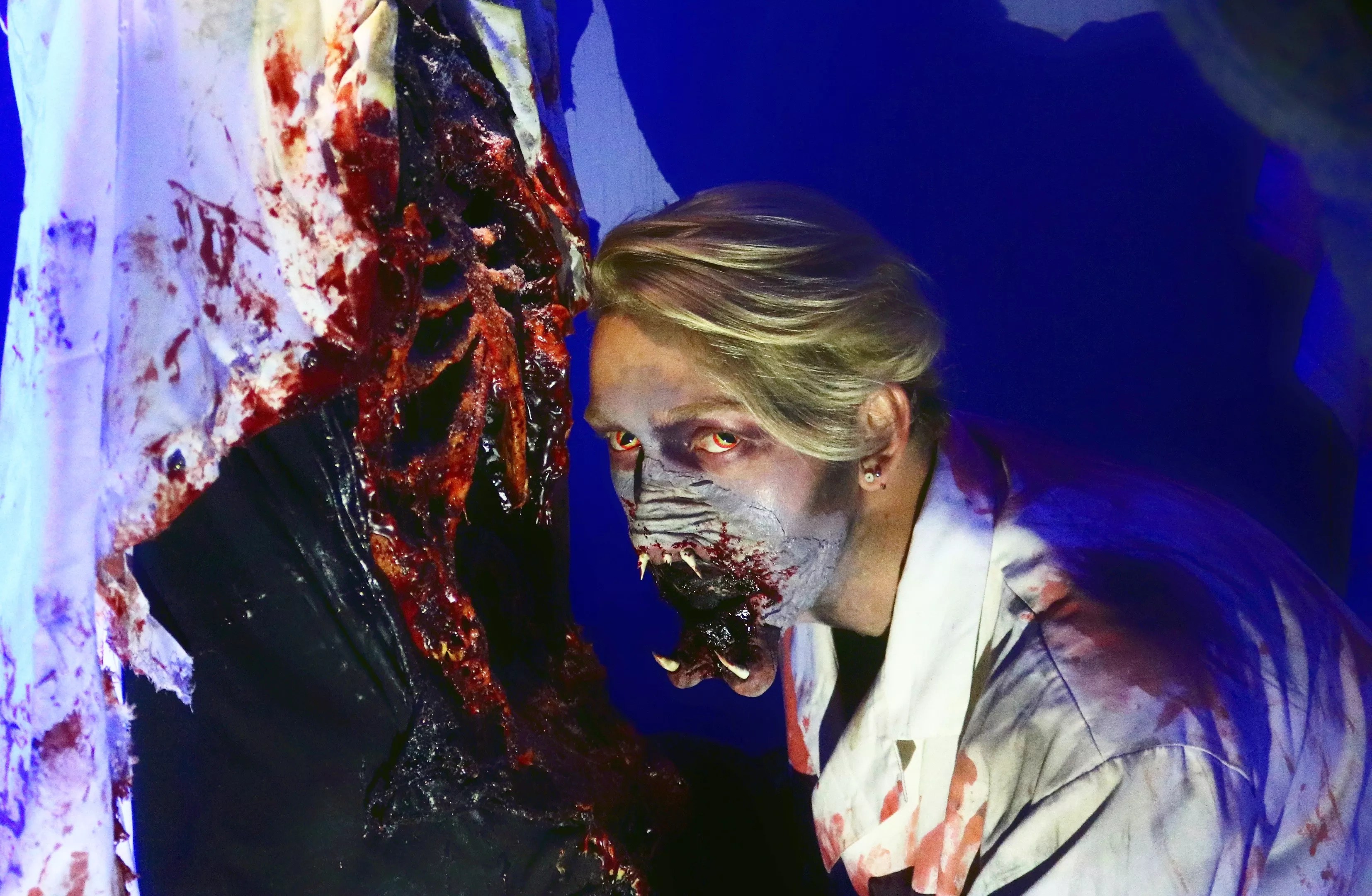 Actors dressed up as walking corpses, murder victims, or the undead mill around the backstage getting ready for a night of serving up horrors. A stereo tuned to hard rock radio station KUPD belts out Nine Inch Nails’ “Head Like A Hole.” A half-dozen makeup artists are busy applying pustules, bleeding wounds, skin lesions, and bruises to their faces and arms. Other employees are helping people get into their costumes or going over details about where actors will be stationed in either Sanctum of Horror’s two haunts.