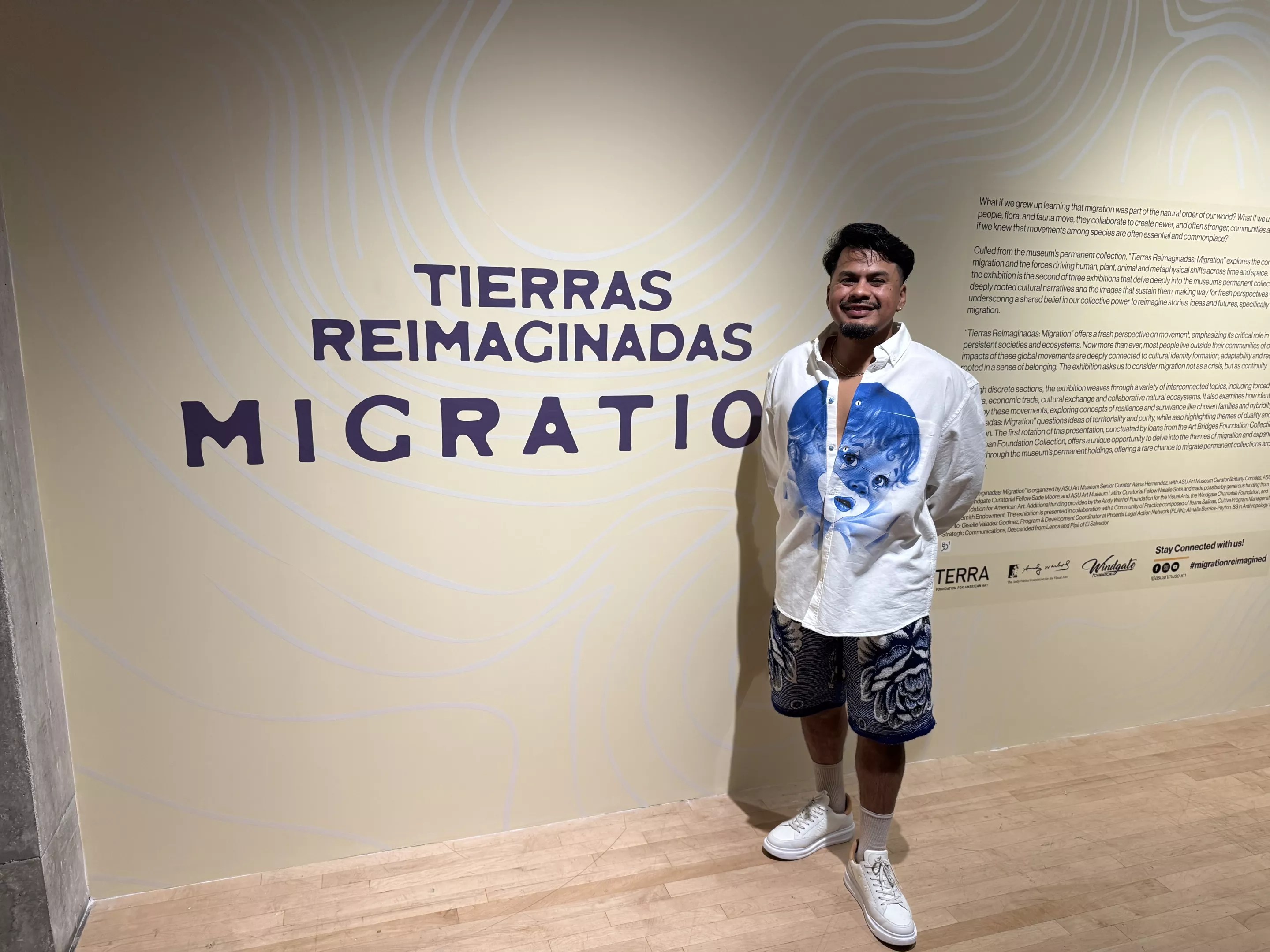 Poet Yosimar Reyes in front of the “Tierras Reimaginadas” gallery statement during the opening reception on Sept. 13.