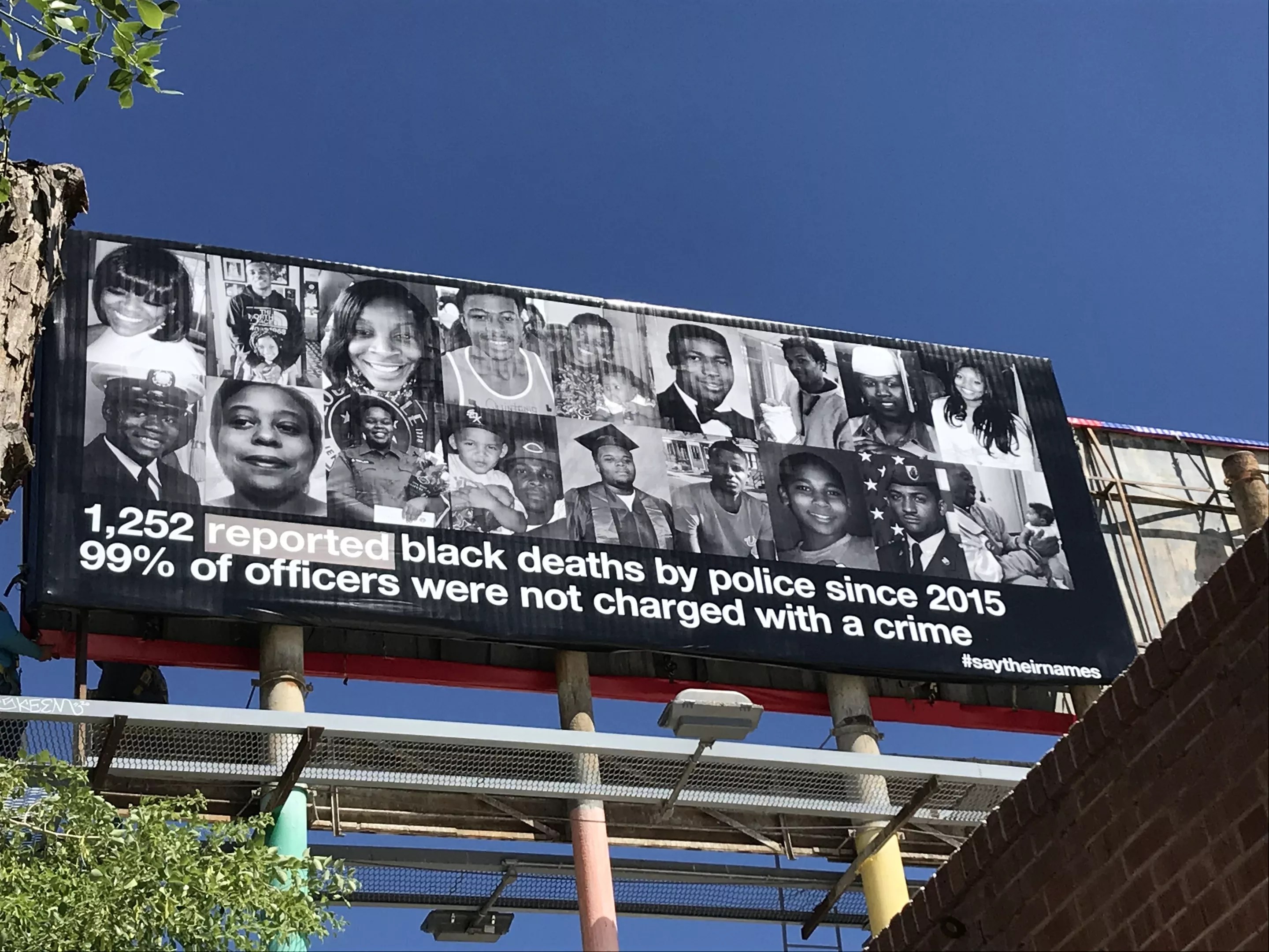 She’s compiled a list of all the people pictured on the billboard, along with brief bios and synopses about the circumstances of their deaths. Below the 18 faces, Fiorito added two lines of text addressing the number of black people killed by police officers since 2015, culling from an online database called Mapping Police Violence.