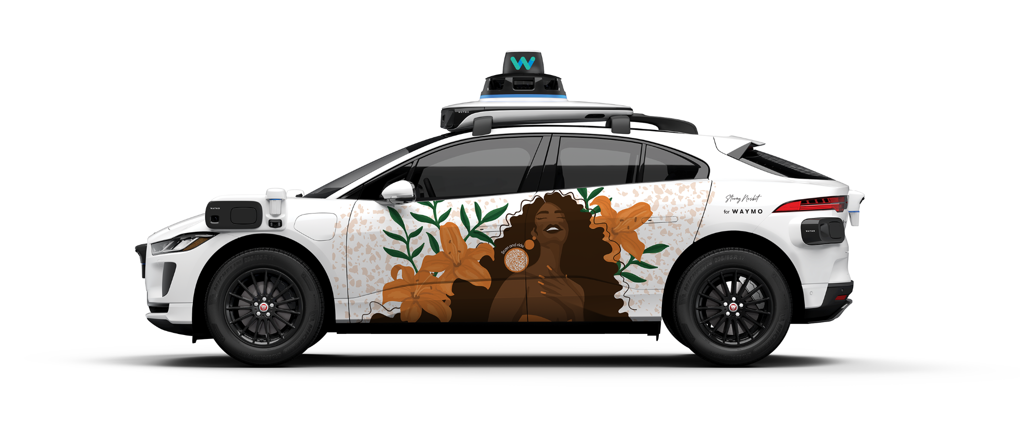 Waymo’s parent company, Google, has been wrapping cars “since our earliest days,” said Waymo spokesperson Sandy Karp. The Waymos in San Francisco were first wrapped a couple of years ago, but Waymo began to wrap Phoenix’s fleet at the beginning of May. Six artists from the cities that Waymo serves are participating to create 12 different designs. Two of these artists are based in Phoenix – Poppell and Stormy Mae, whose designs feature Black women and flowers.
