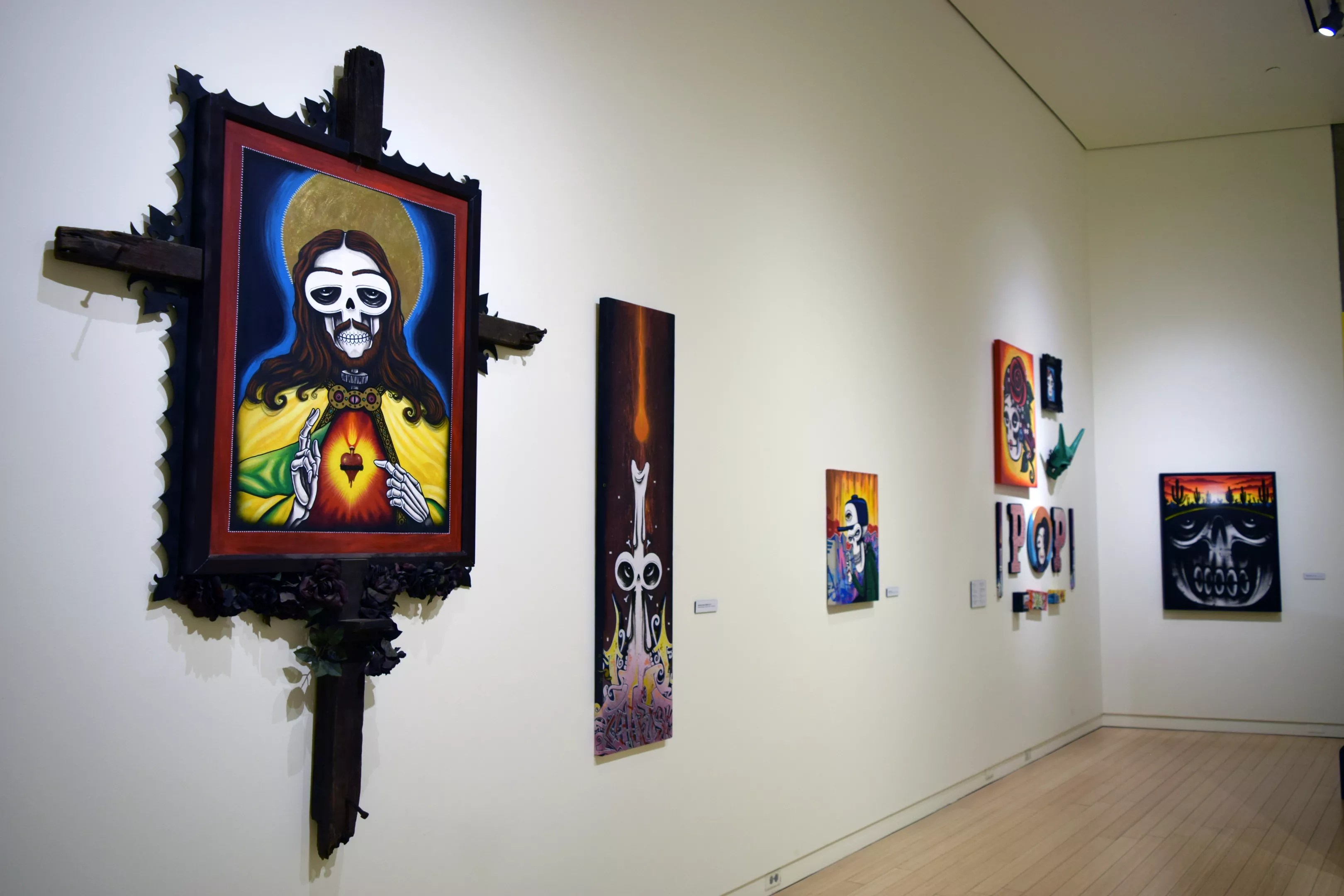 Jesus may have never looked as laid back – and that’s saying a lot – as he does in Cota’s Personal Jesus triptych. A larger piece featuring the historical and biblical figure is flanked by two smaller pieces, each with a slinky, white ghostly character. Jesus sits between them in an ornate wood frame with a cross as its backbone. His heart-shaped pendant is luminous, and his right hand has its first two fingers up. He’s either making a point or offering a mellow version of the universal peace sign.