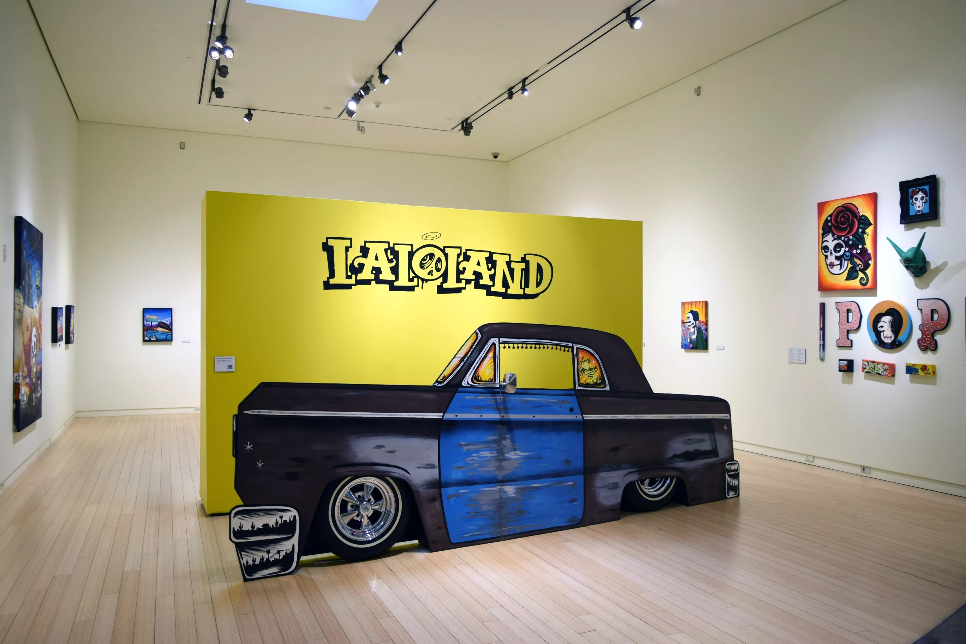 You know an exhibition is inviting when the first thing you see is the show’s title across a bright yellow backdrop, and in front of that signage, a large-scale painted panel in the shape of a classic lowrider. Not just any sign, this one allows you to put yourself behind the wheel. It’s the perfect show selfie – you get to be a part of Cota’s art.