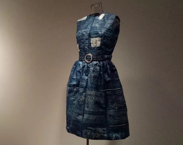 “In the Company of Women” includes Naturalized Citizen by Phoenix-based artist Annie Lopez. It’s a paper dress form made with family naturalization records using the cyanotype photography that creates a characteristic blue color.