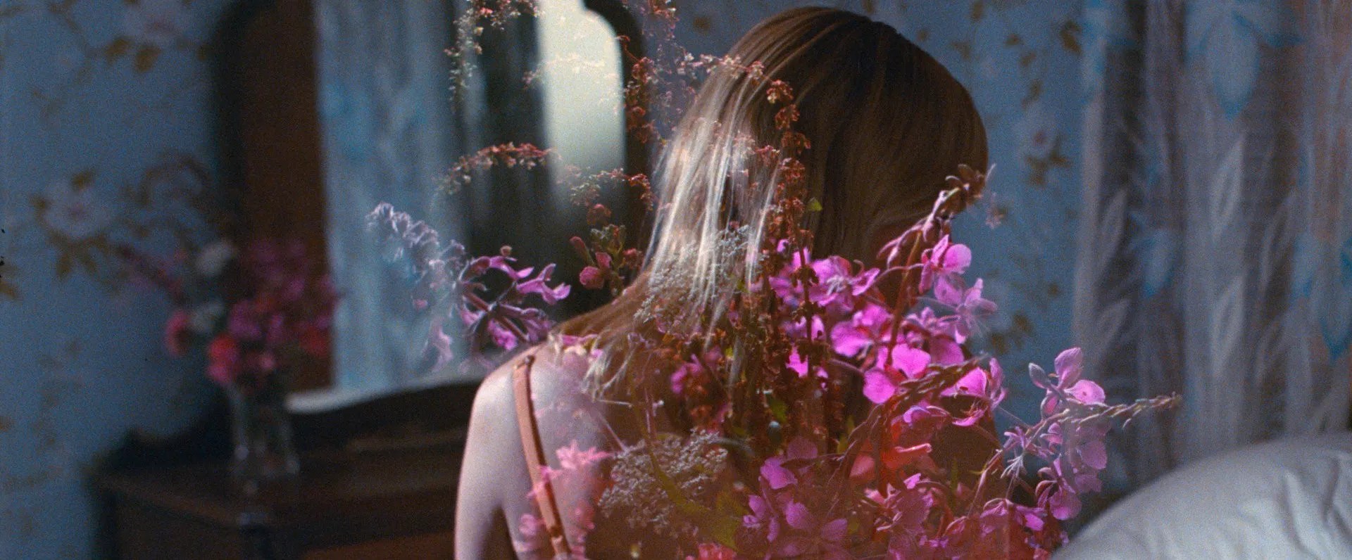The rest of the film finds Theresa slumping her way through guilt and loss, smoking up more and more often, sleeping on floors and on naked bed frames, haunting a redwood forest in a hand-me-down slip, staring at her face in a bathroom mirror as the shower runs. In the bathroom, wiping steam from the glass, she seems overwhelmed, in a convincingly stoned way, by the number of steps it takes to perform a task like showering. She ends up sitting in the tub as the water runs, still wearing her underthings.