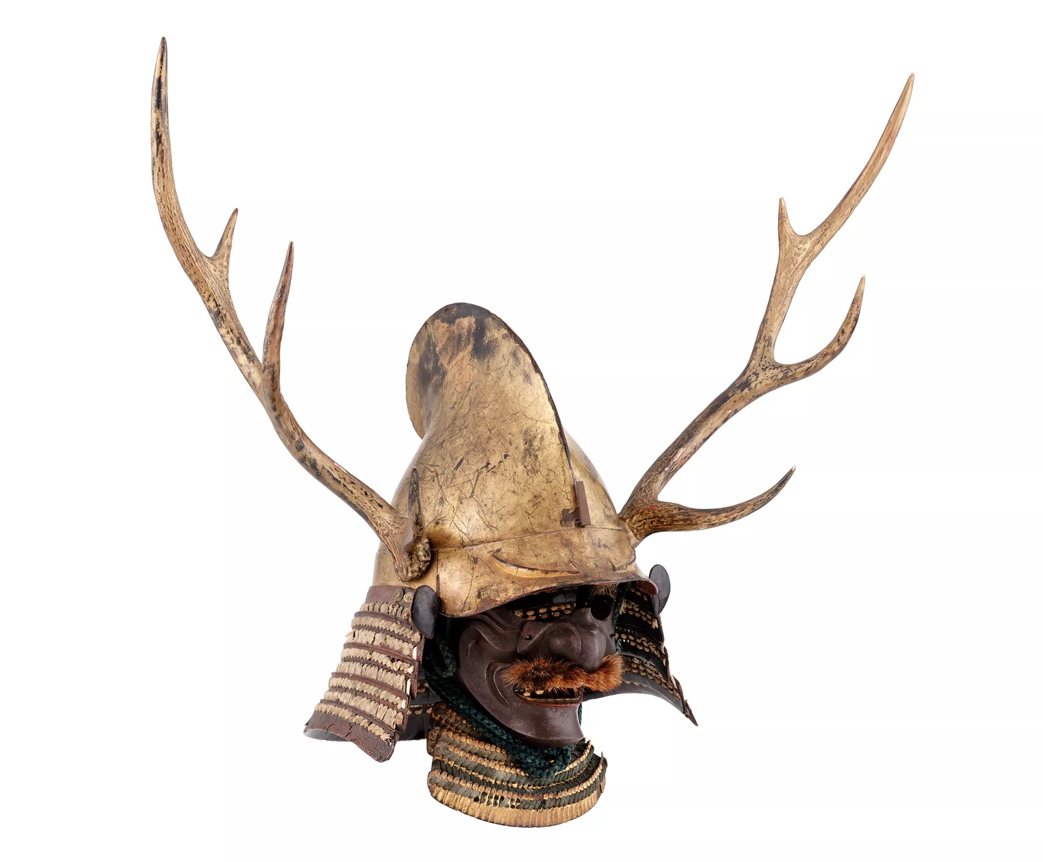 “Invisible Mexico” Unknown, eboshi kabuto (eboshi-shaped helmet) and menpo (half mask), late Muromachi to Momoyama period, late 16th century. Iron, gold lacquer, bronze, horn, horsehair. Brad Flowers