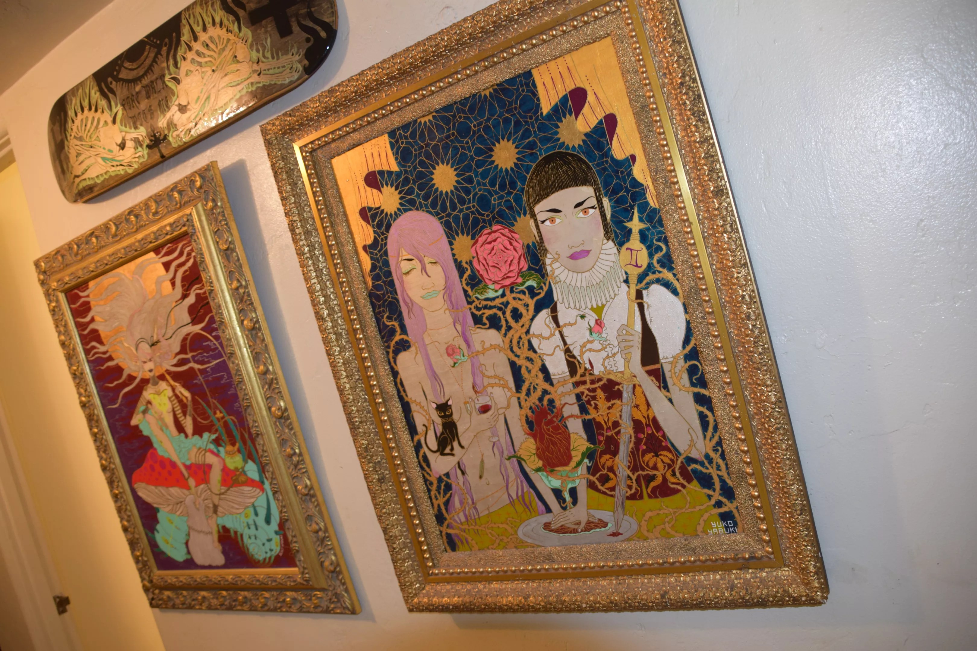 Attracted early on to fashion, her artwork once focused on shoes and other things she deems material rather than spiritual. Today, her work is infused with spiritual themes – often incorporating dragons and other mythological elements. You’ll see plenty of cats, too. And nods to her other interests, including punk-rock subculture.