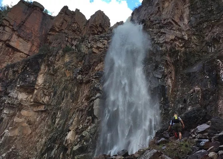The descent is 1,625 feet and it’s important to remember that this will be a climb on your way out. At 6 miles, you’ll reach Reavis Creek and follow it upstream, where you’ll cross over the creek several times. This involves much boulder-hopping and often very cold water. If the flow is good, you’ll definitely hear the waterfall before you see it. The sounds will beckon you closer, until finally you’re face to face with this unbelievable sight right in the middle of the desert.