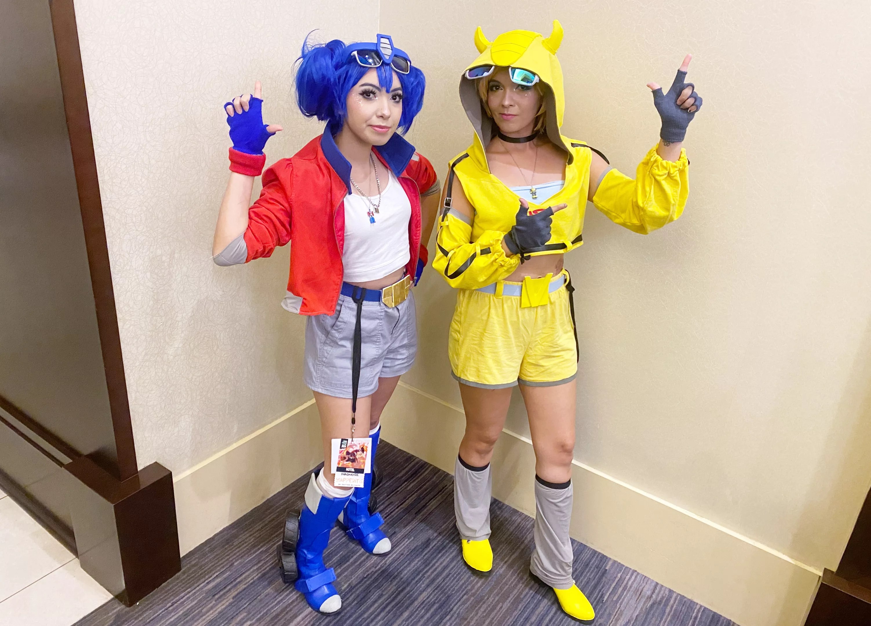 Local cosplayer Dez Meow, left, and a friend dressed up as human versions of Optimus Prime and Bumblebee from Transformers.