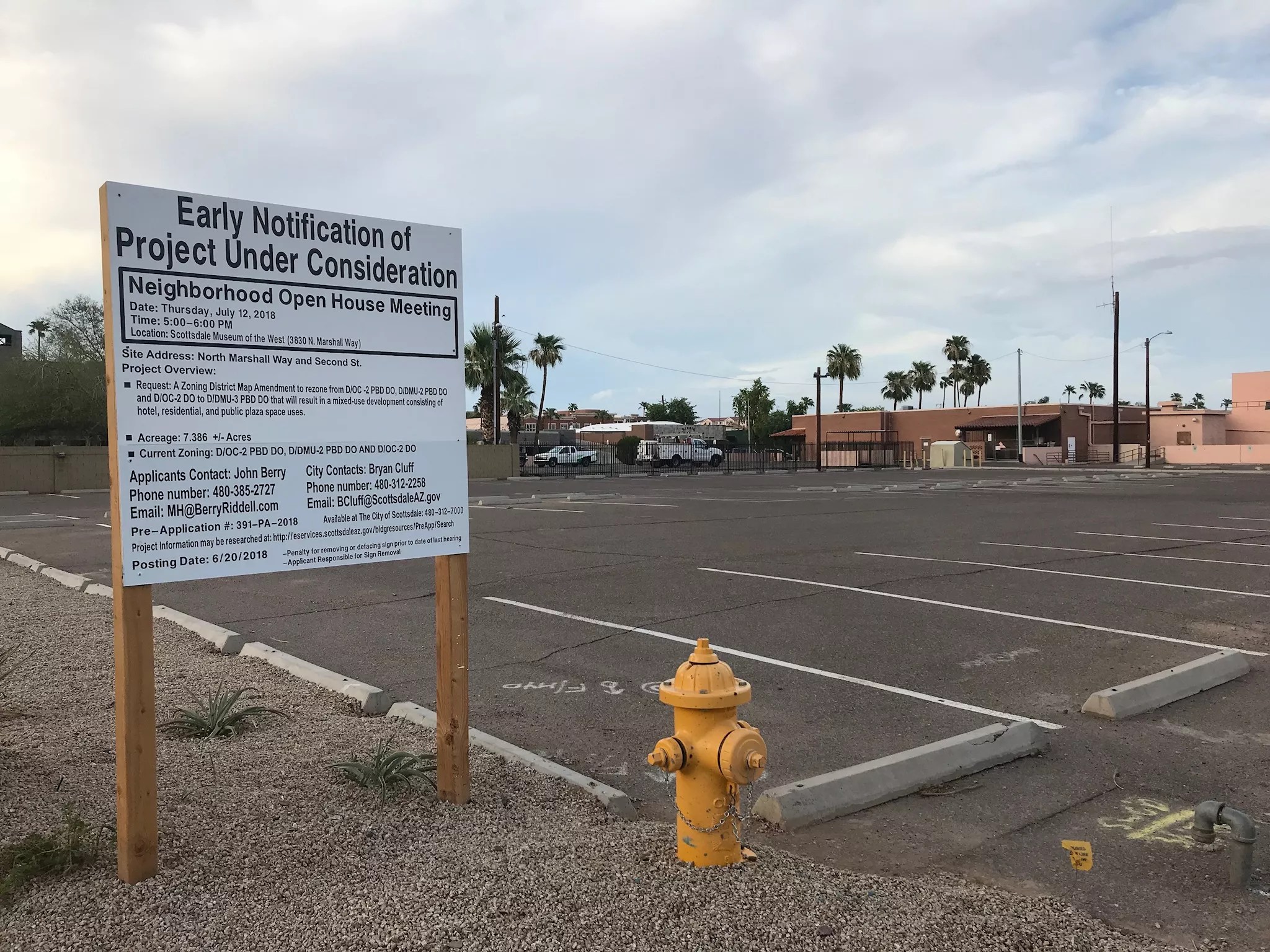 Here’s where developers plan to put a four-story building of rental units, at North Marshall Way and Second Street.