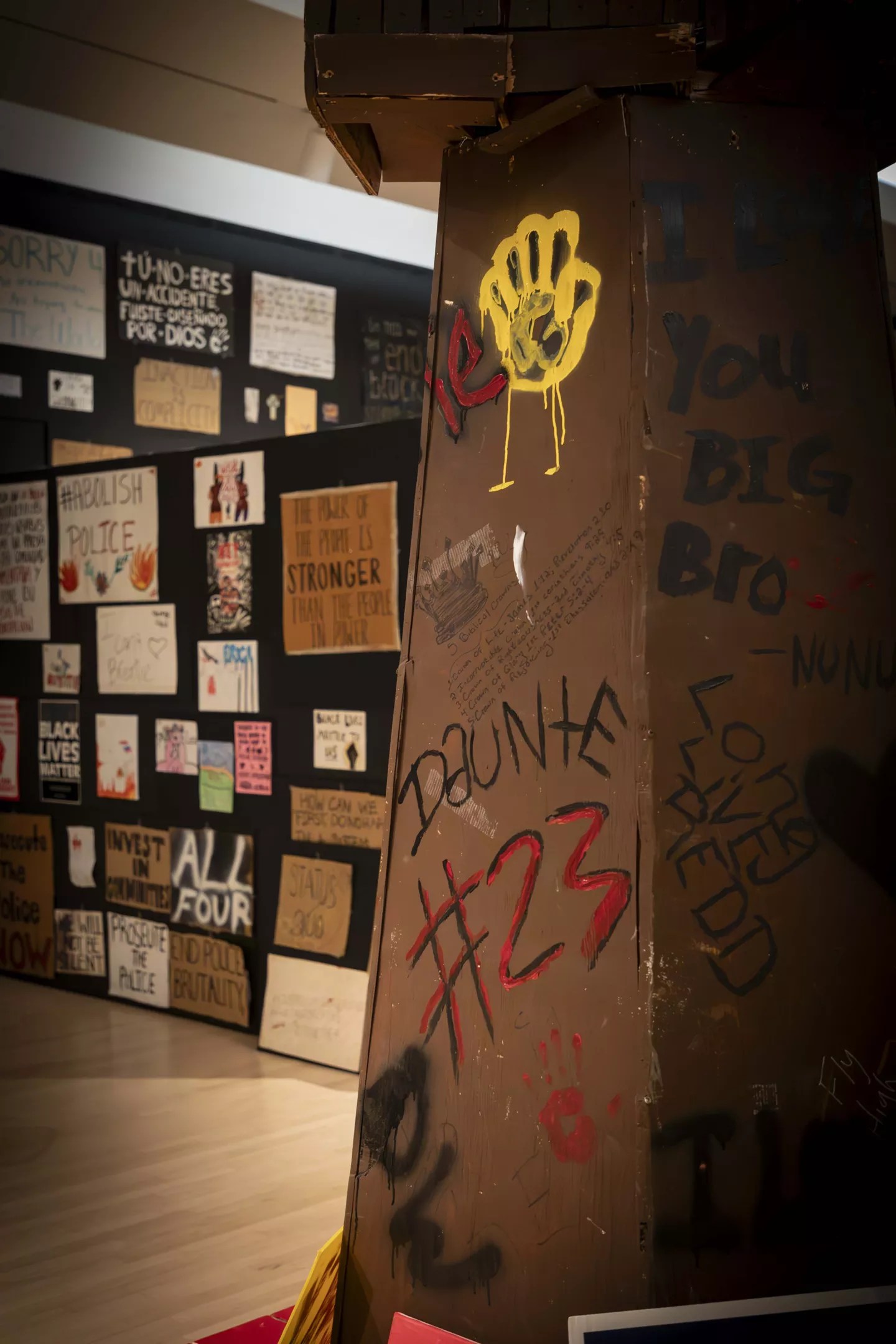 The signs are big and small, square and round and heart-shaped. Some are written in Spanish. They’re scribbled on notebook paper, written in marker on bright poster board, angrily scrawled on the walls of cardboard boxes, painstakingly printed by small children who misspell “racism” and write their Ks backward. (All the signs in the exhibit that were made by children are placed lower on the wall so other children can see them better.)