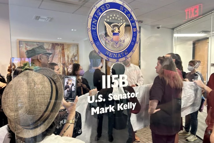 Activists demand that the Arizona senator call for a ceasefire in the Israel-Hamas war.