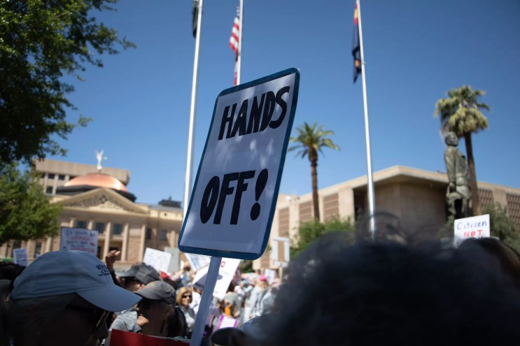 Walking from the Arizona Capitol to downtown, hundreds of Arizonans aired their grievances with Donald Trump and Elon Musk.