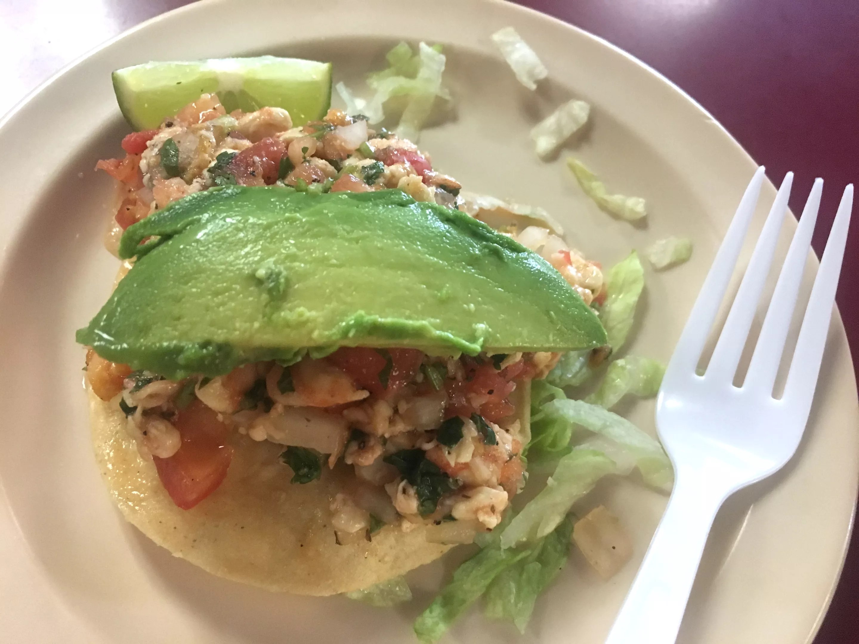 Ceviche tostadas are roughly the diameter of tennis balls (small) and CDs (large). In 20 minutes, at least five were whisked out to various tables. The smaller costs less than $3. Shrimp chopped and chilled mounds nicely atop a crunchy base. The shellfish is mild and lifted by mild citrus.