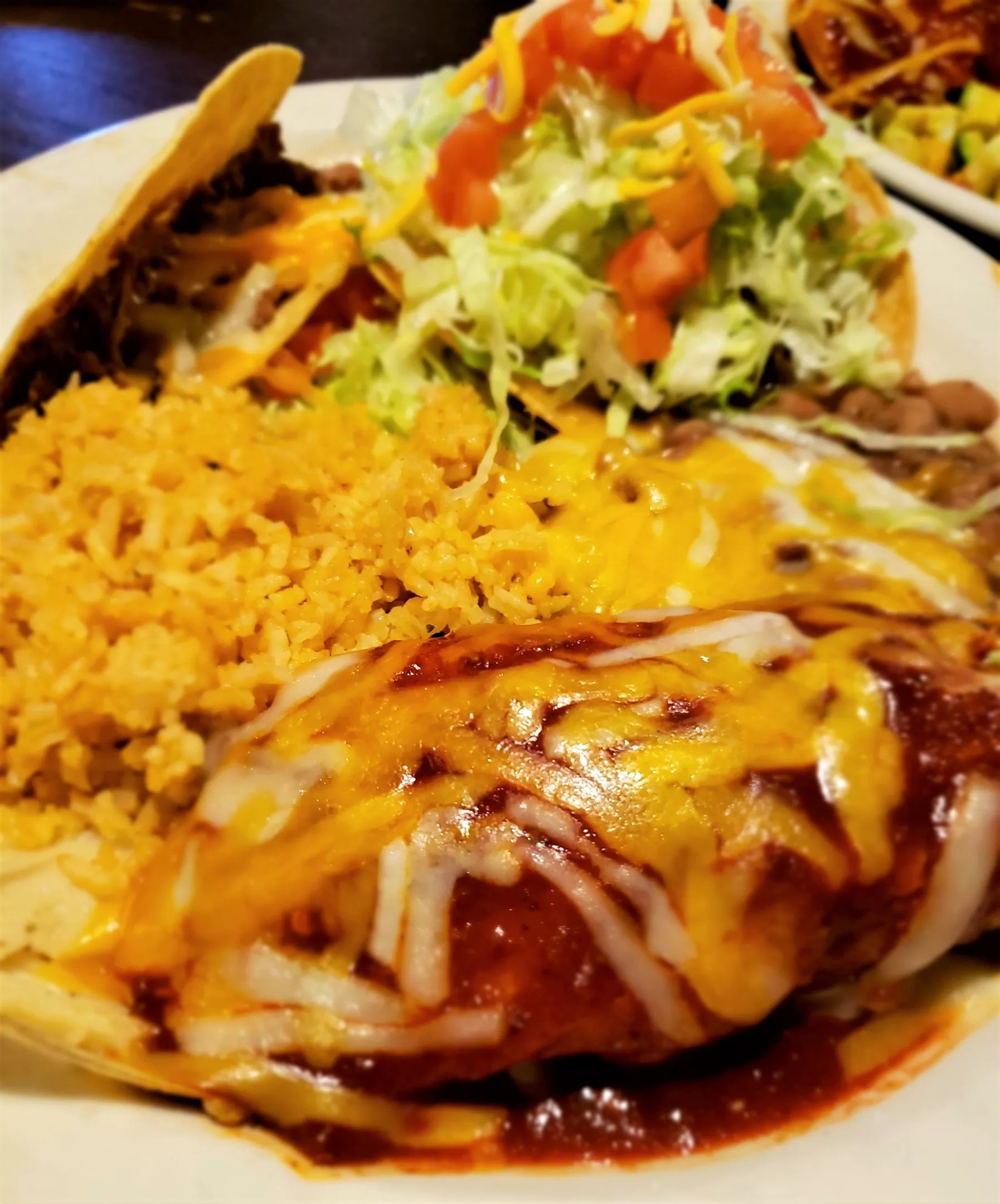 The Original Blue Adobe Grill Chimichelada: a mini chimichanga served with a side enchilada topped with a surprising and delicious amaretto mushroom cream sauce.