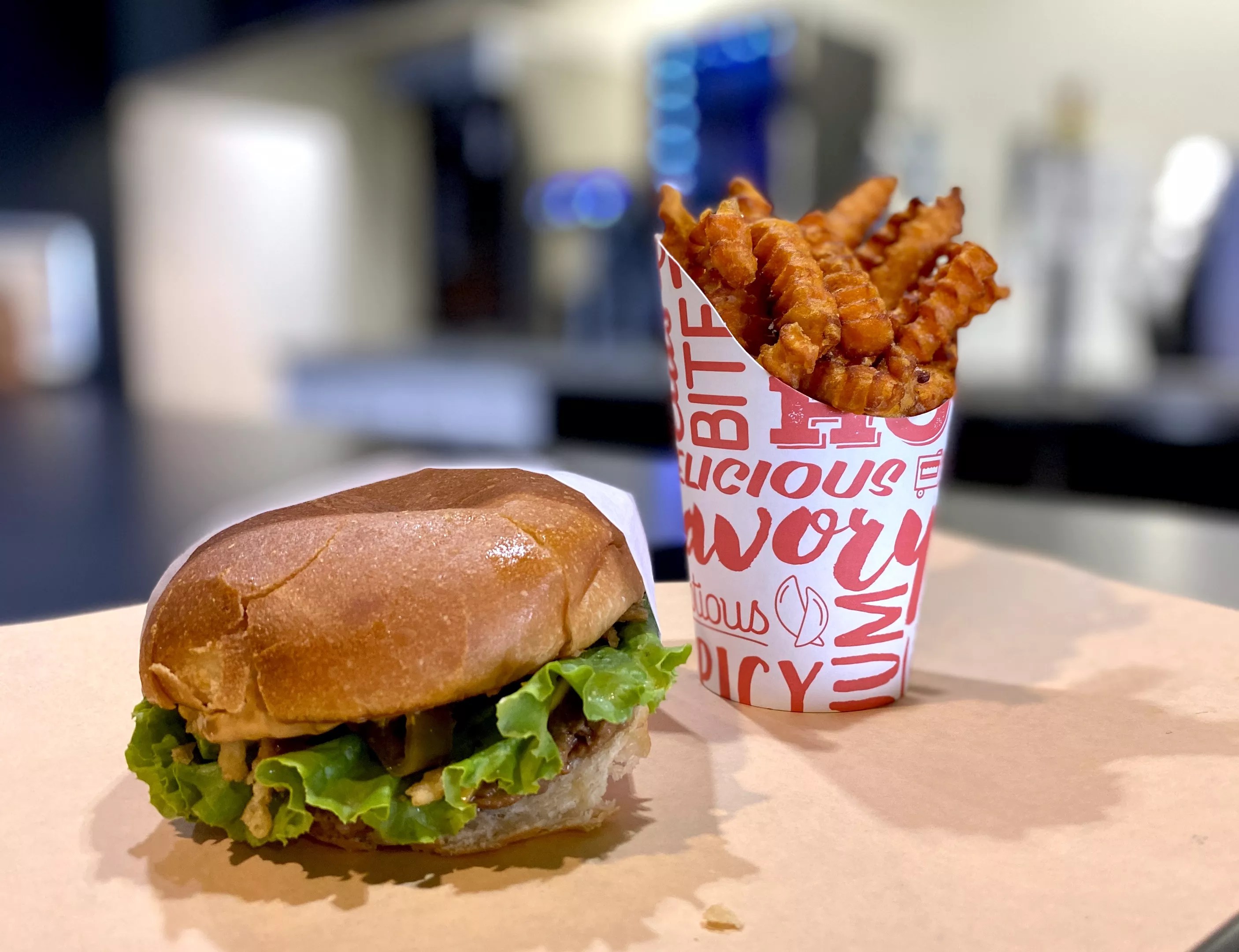At UNiQ Burger, the Southwest Burger is topped with avocado, jalapenos, fried onion strings, spicy aioli and vegan cheese.