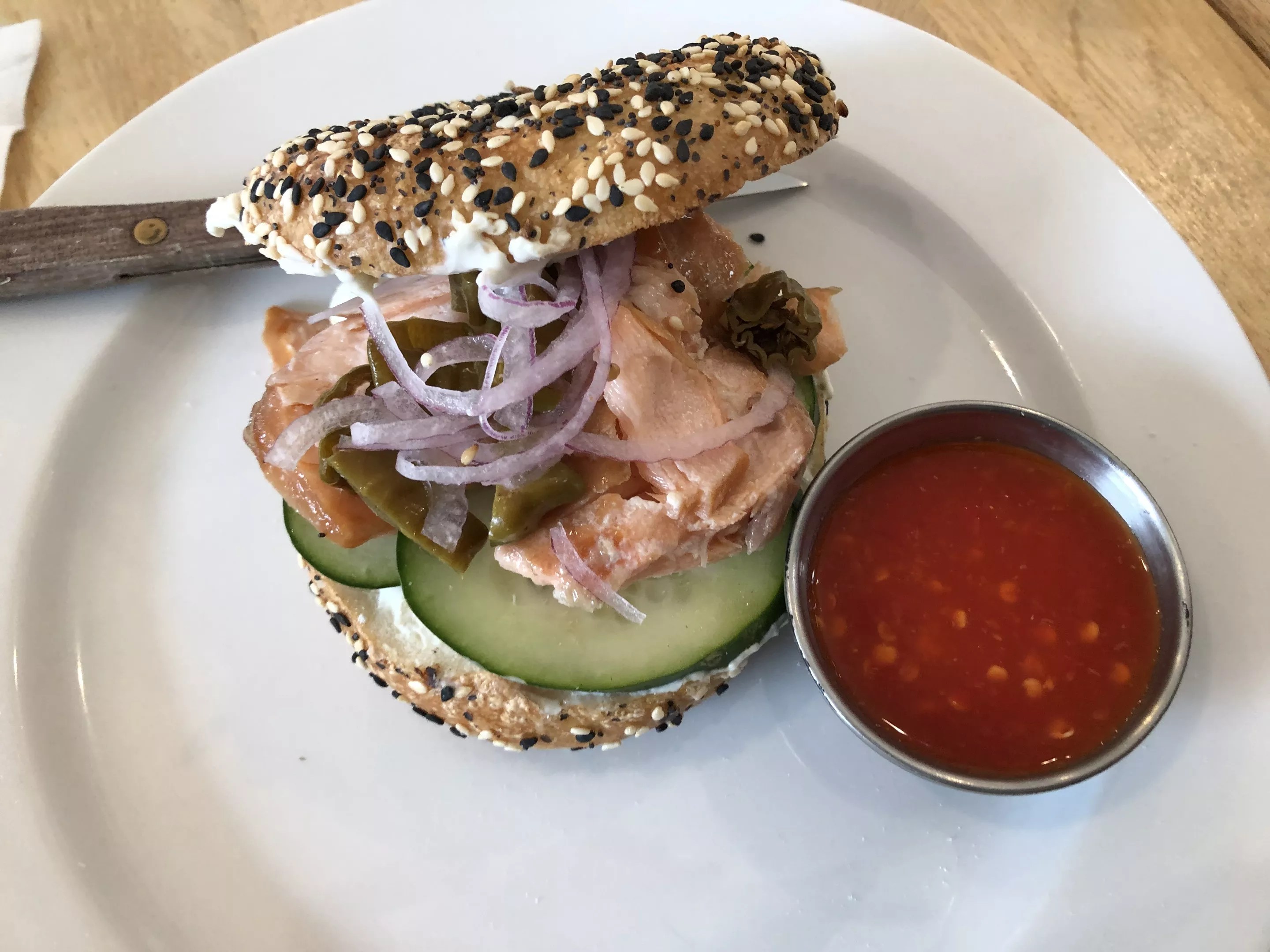 For another $1, you can add a tin of crimson hot sauce to your breakfast or lunch order at New Wave Market. This sauce is viscous and slow to pour, showing whole round seeds through a surface that quickly turns opaque. Country and Sergio Velador craft this hot sauce by lacto-fermenting Fresno chiles. The gentle fermentation serves to quell the fire some, resulting in a sauce that spotlights the vegetal, robust, deep secret nature of the pepper. There is some tang, but not much. The current of heat washes low. This is a neutral sauce that won’t bring an overly interfering flavor to your egg sandwich, even with a massive dunk.