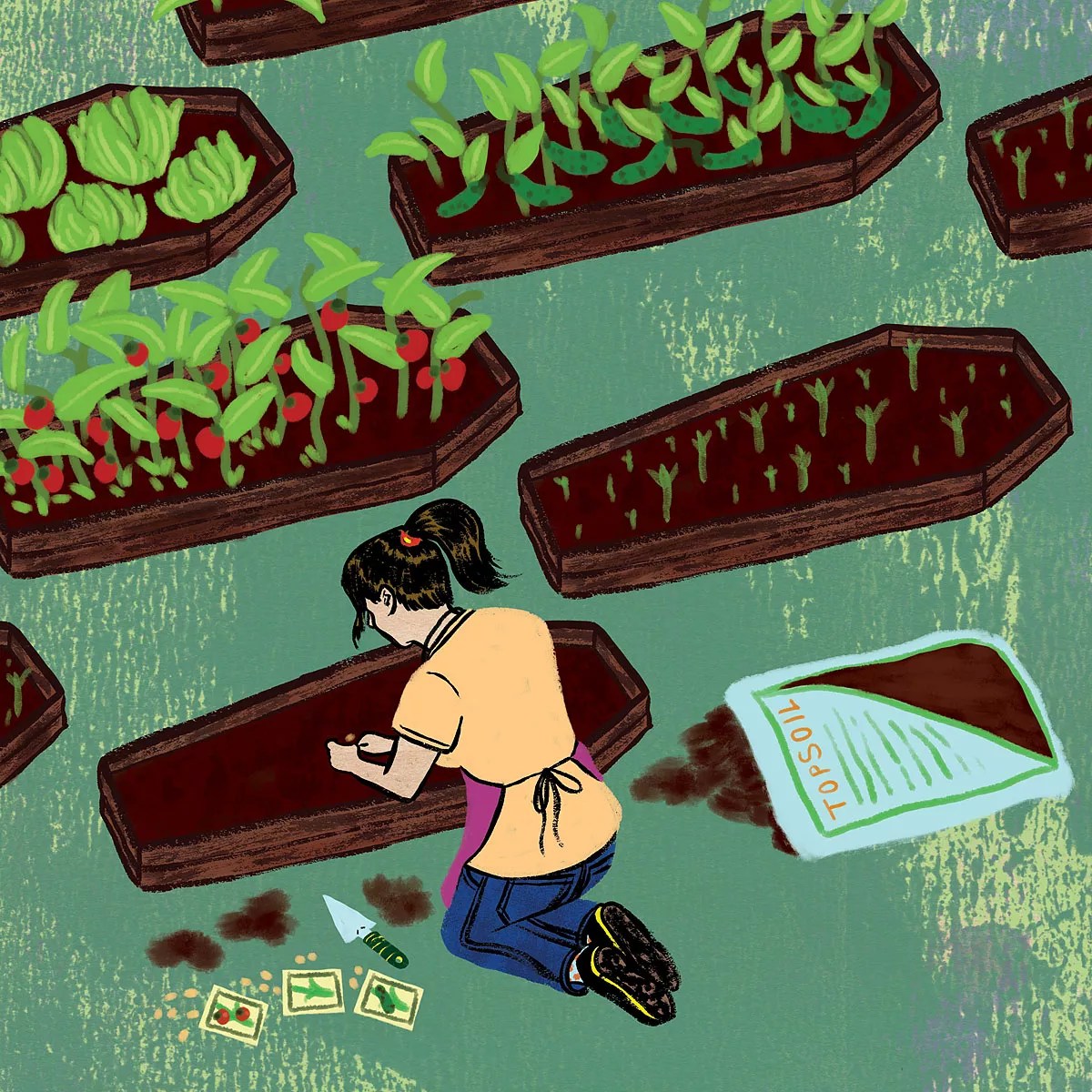 The next year, my garden grew bigger. I built more coffins, bought more soil, and finally planted peas. I planted an herb garden where dead trees once stood, and passed basil and vegetables over the fence to my neighbors.