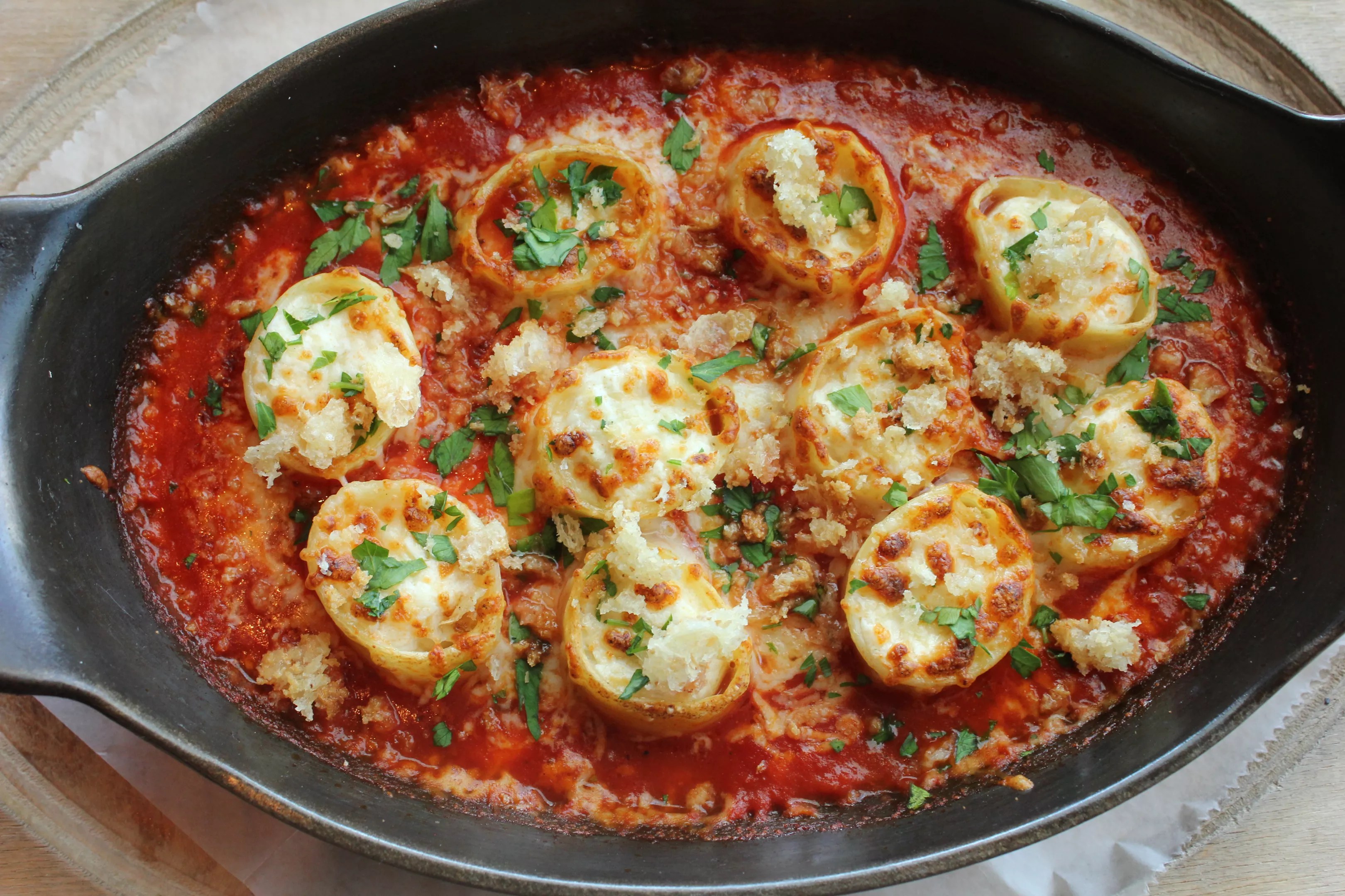 The new St. Francis menu boasts a cool eggplant dip kicking with refined, Middle Eastern flavors, enriched with yogurt, smoked paprika, and toasted pine nuts. It sports a pasta dish – baked calamari (the tubular noodle, not the squid) – roasted in the oven with four kinds of cheese stuffed into each hollow, which lie delicately over an ethereally light tomato sauce.
