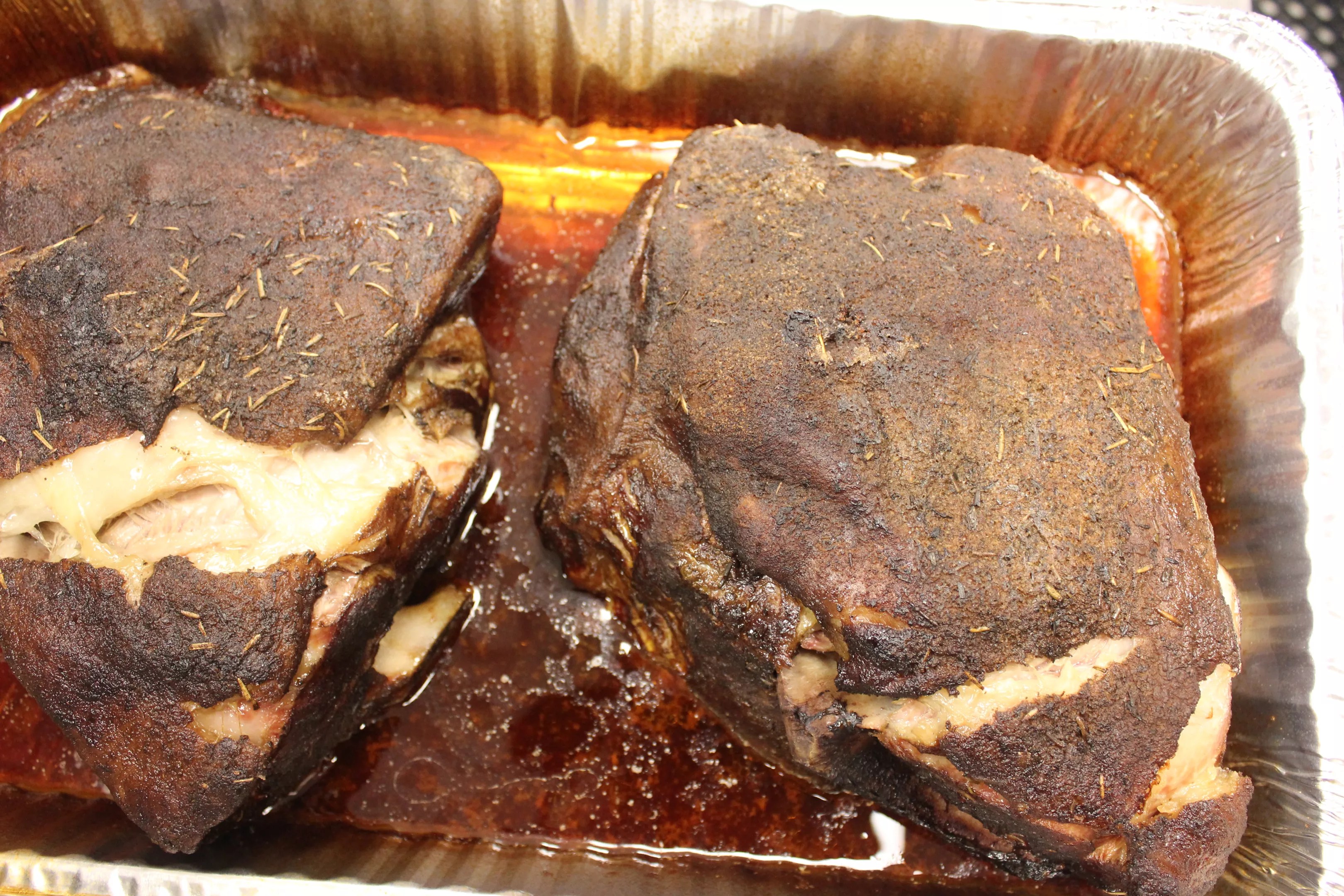 Two barked pork butts hanging out