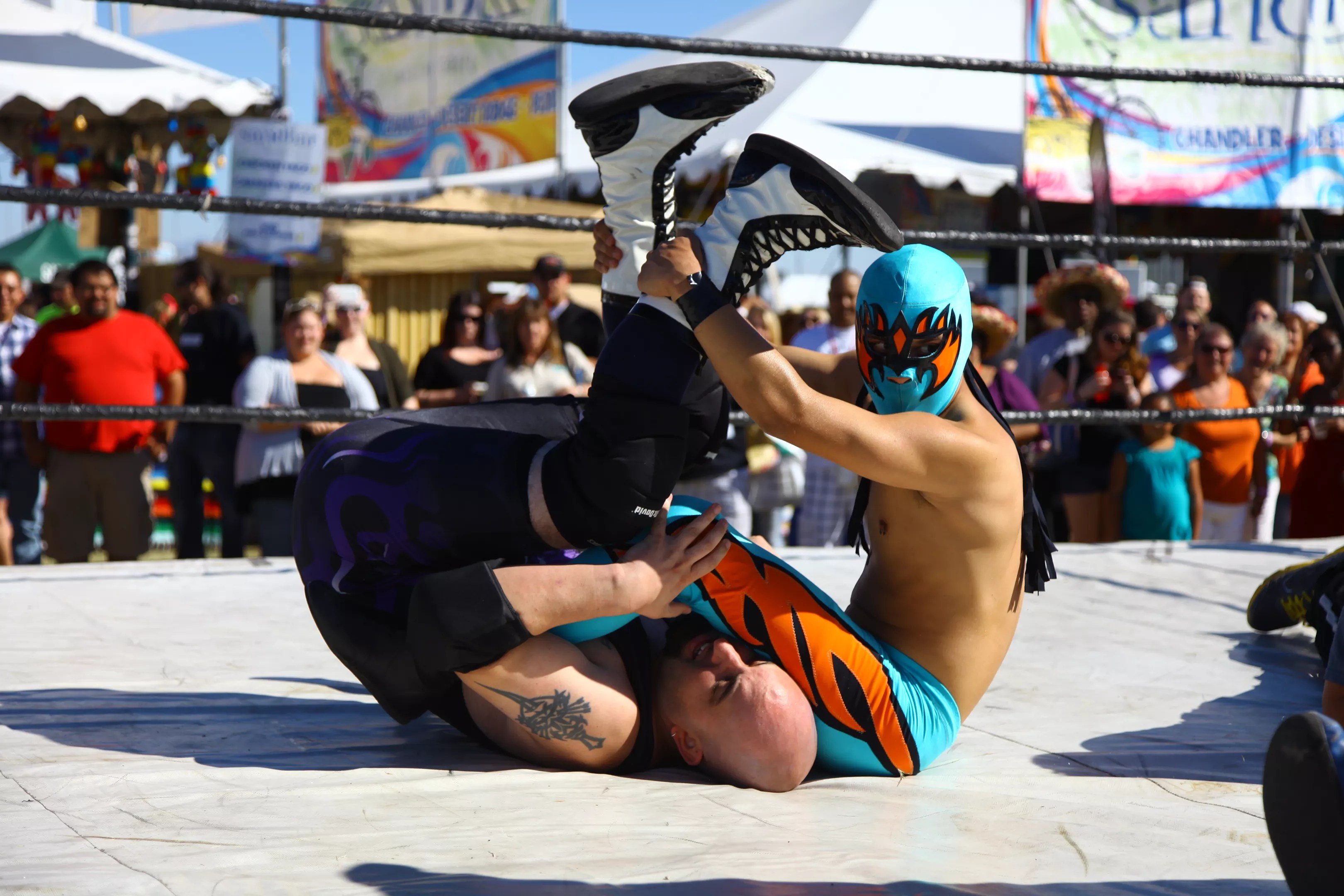One of the entertainment stages features Lucha Libre wrestlers.