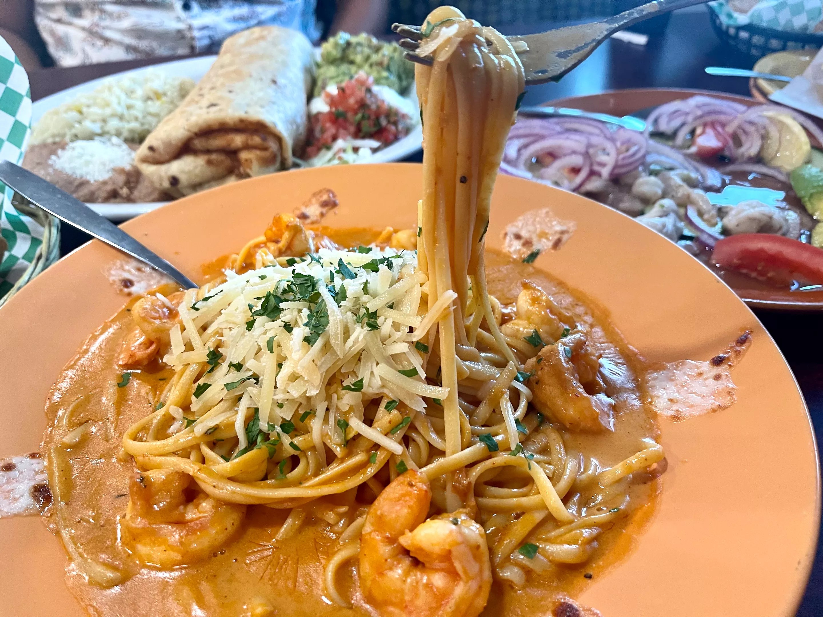 When you think of the menu at a mariscos restaurant, you may picture plates of bright aguachile topped with avocado slices and lime, ceviches served in glass goblets, piles of shrimp and maybe some seafood tucked into tortillas and rolled into burritos or enchiladas. But one thing that probably won’t come to mind is pasta.