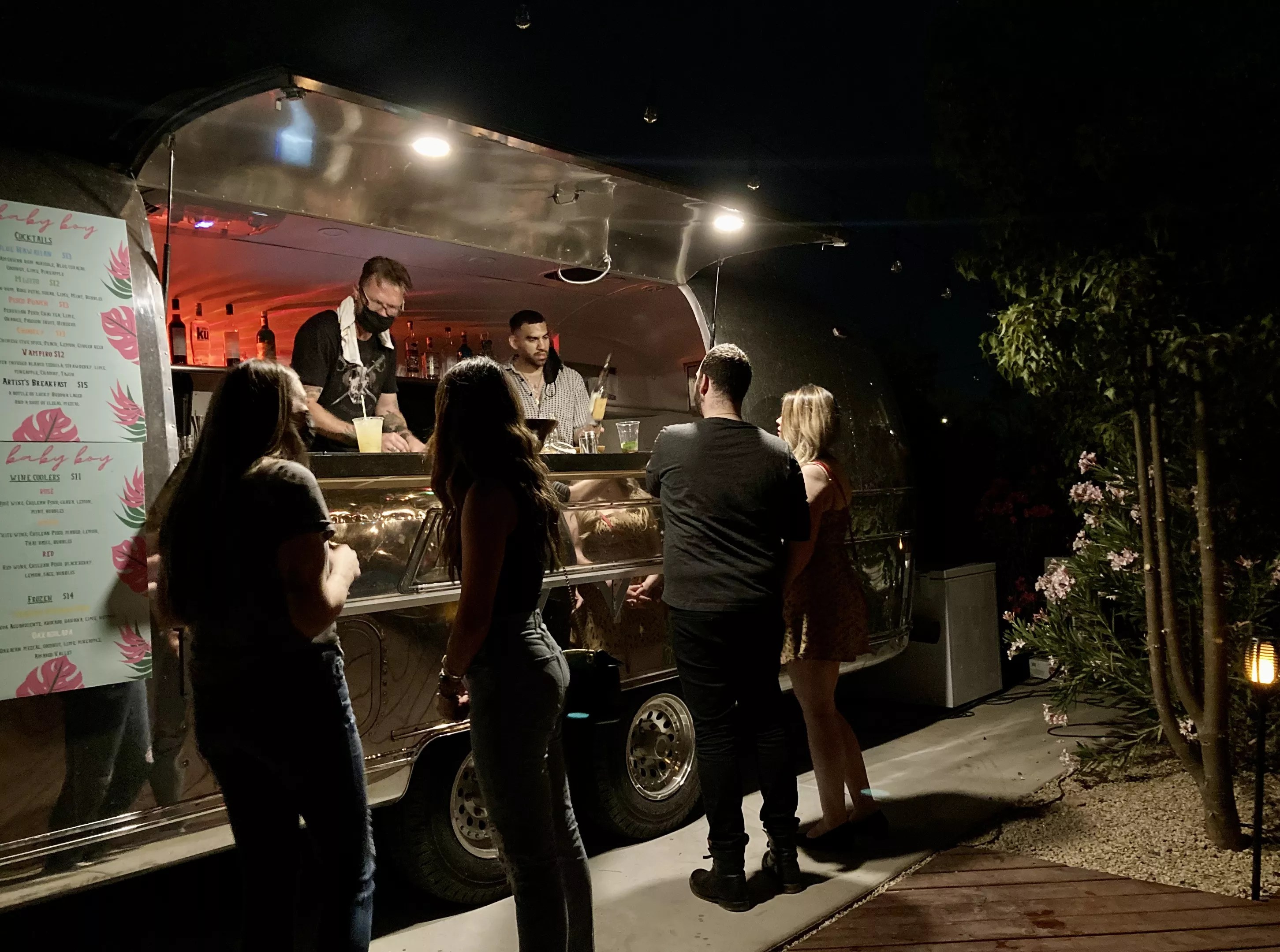 Arrive at the Airstream, and you’ll find bartenders shaking and pouring brilliantly colorful drinks behind the walk-up window. The seating area is completely capped off by privacy hedges adorned with soft lighting and Adirondack chairs. Hip-hop blares.