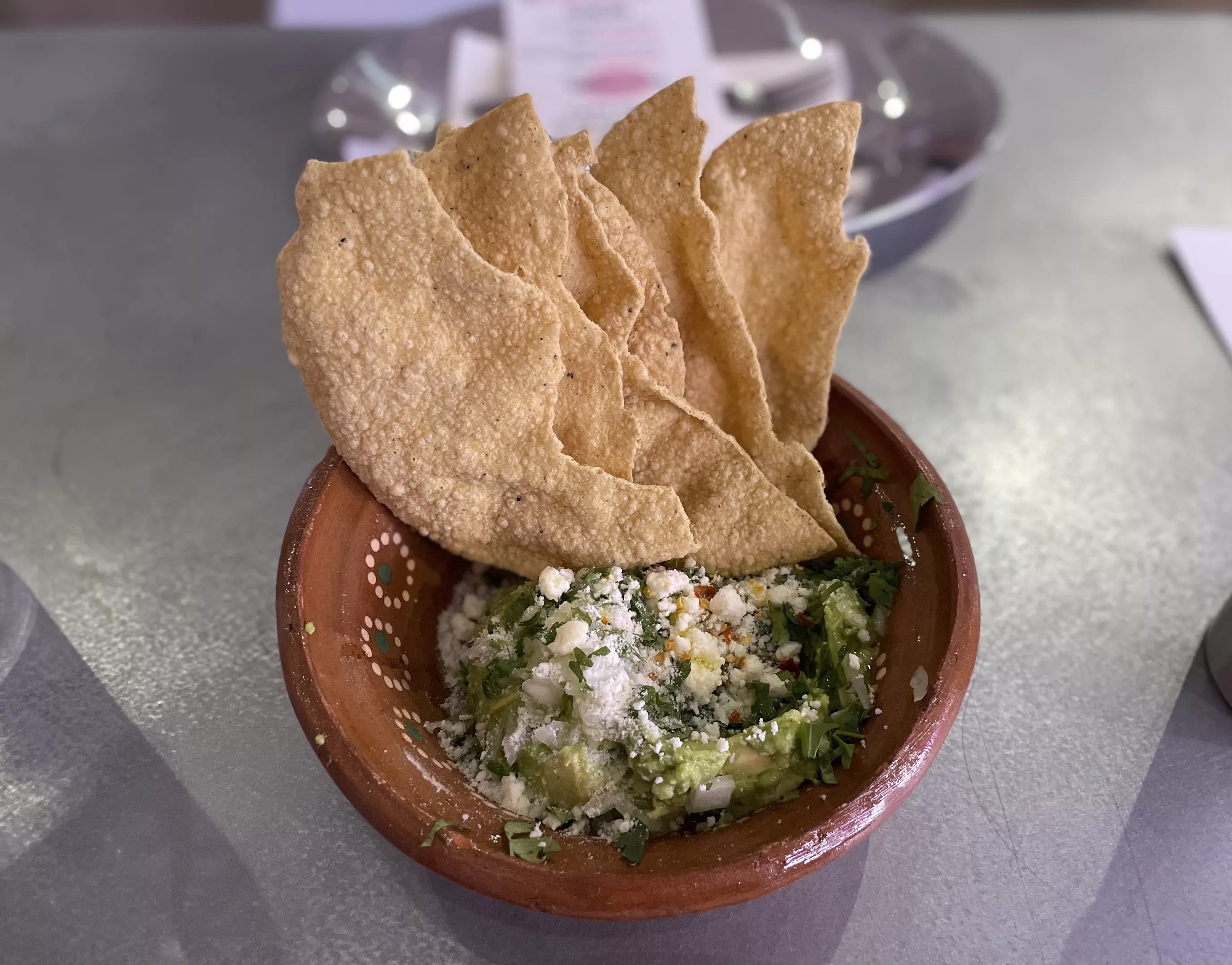 Starters include a quesadilla or aguacate, or avocado, which comes mashed with queso fresco, cilantro, onion chiltepin and olive oil. It arrives in an earthenware bowl with a fan of large, crisp tostadas.