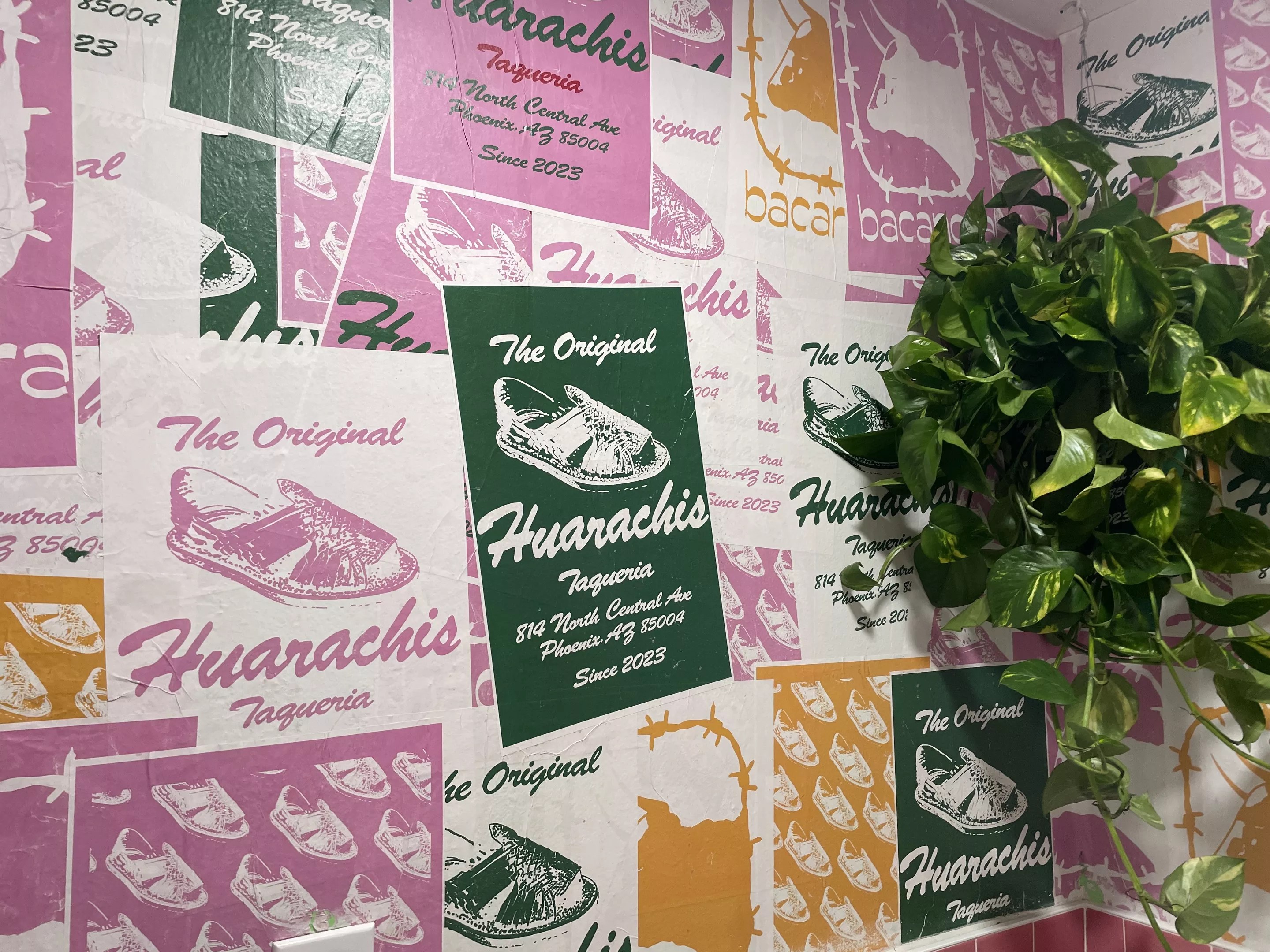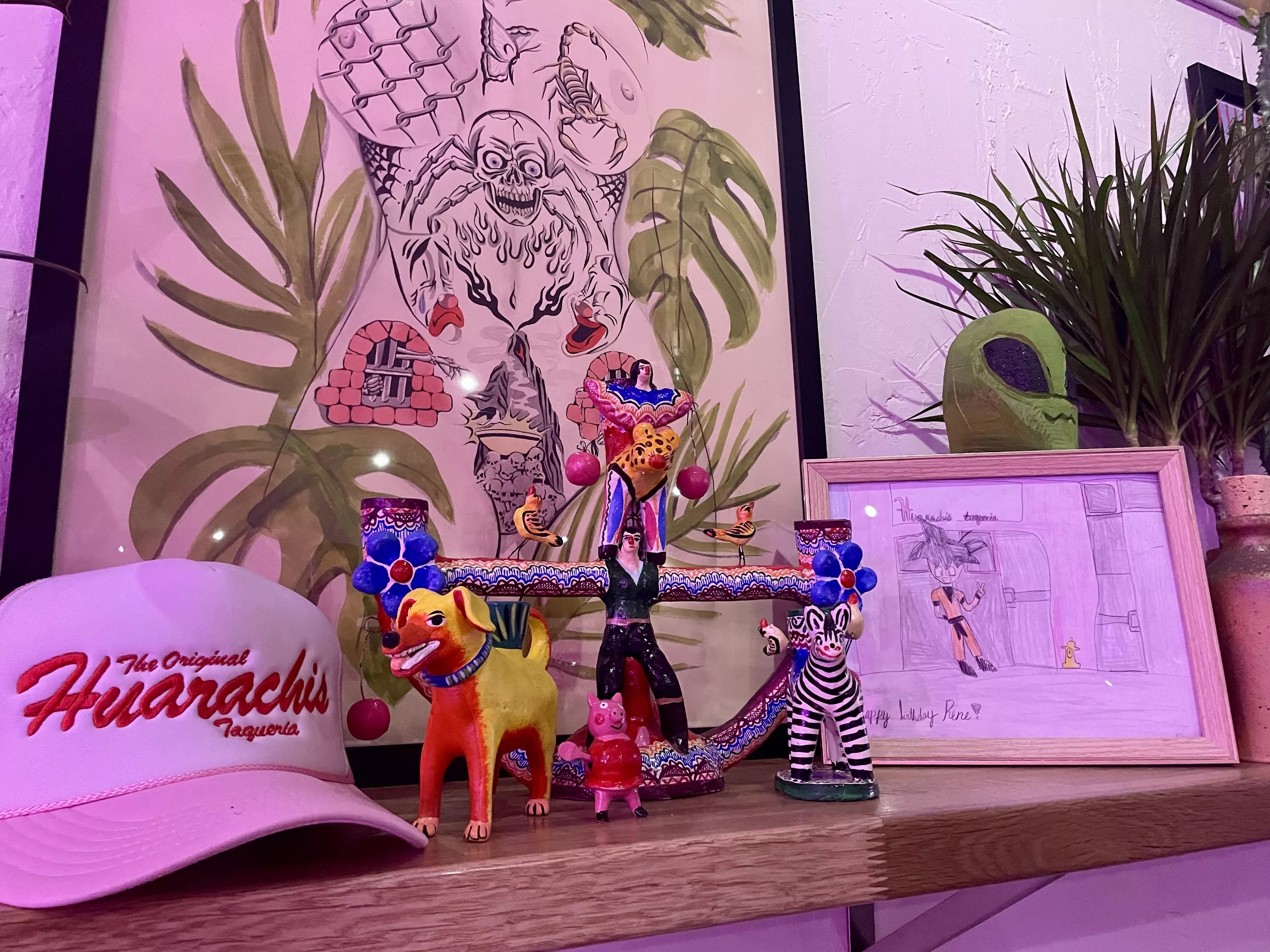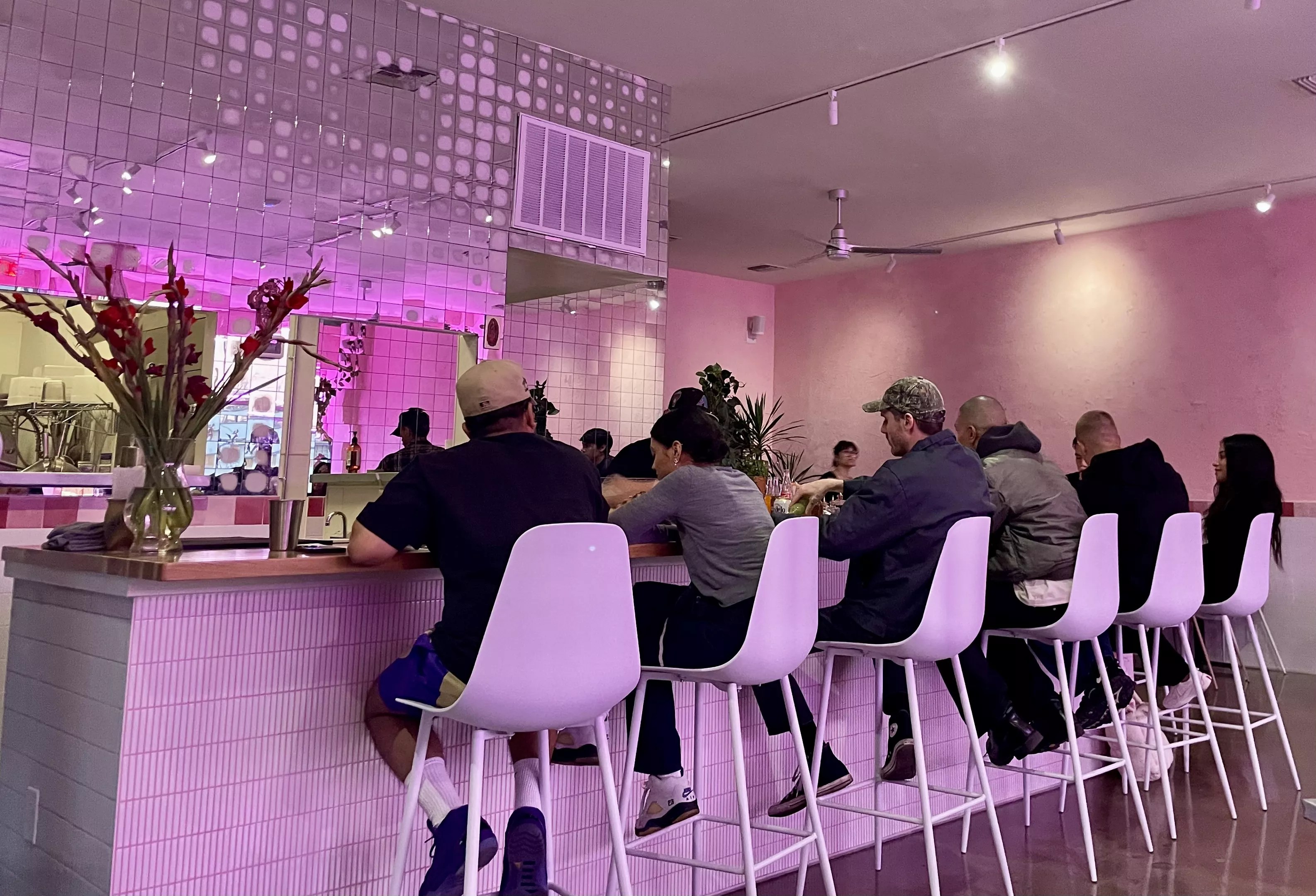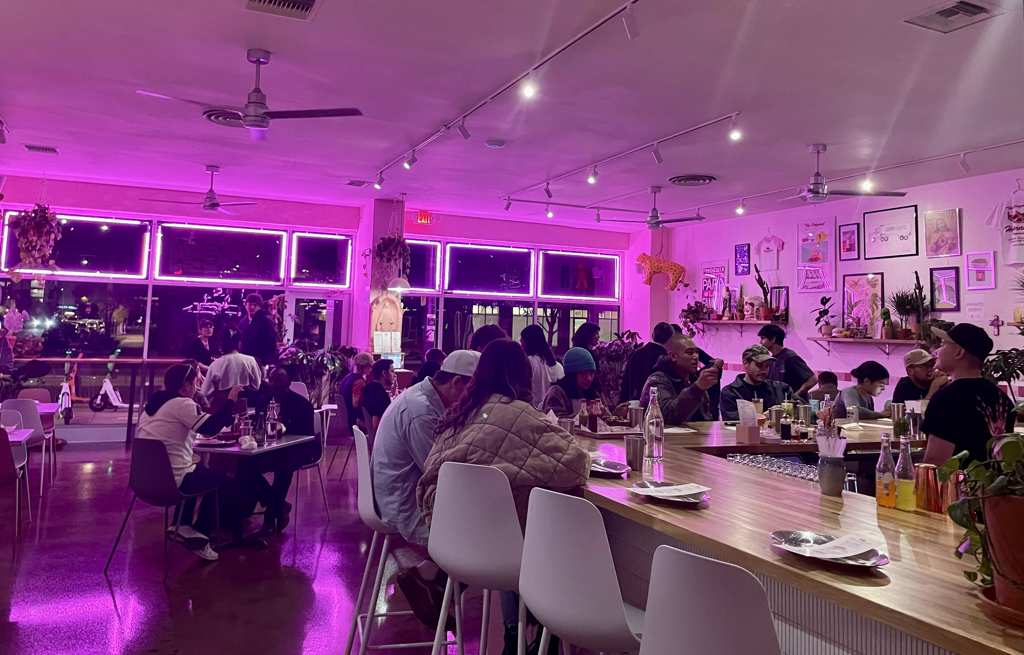 At the Central Avenue taqueria, gone are the royal blue awnings and yellow paint of Rodiberto’s. The stucco has been painted bubblegum pink and the tall windows are framed at the top with neon pink lighting. Clusters of plants fill one of the windows. Along one side of the space, shelves are dotted with art and bric-a-brac.
