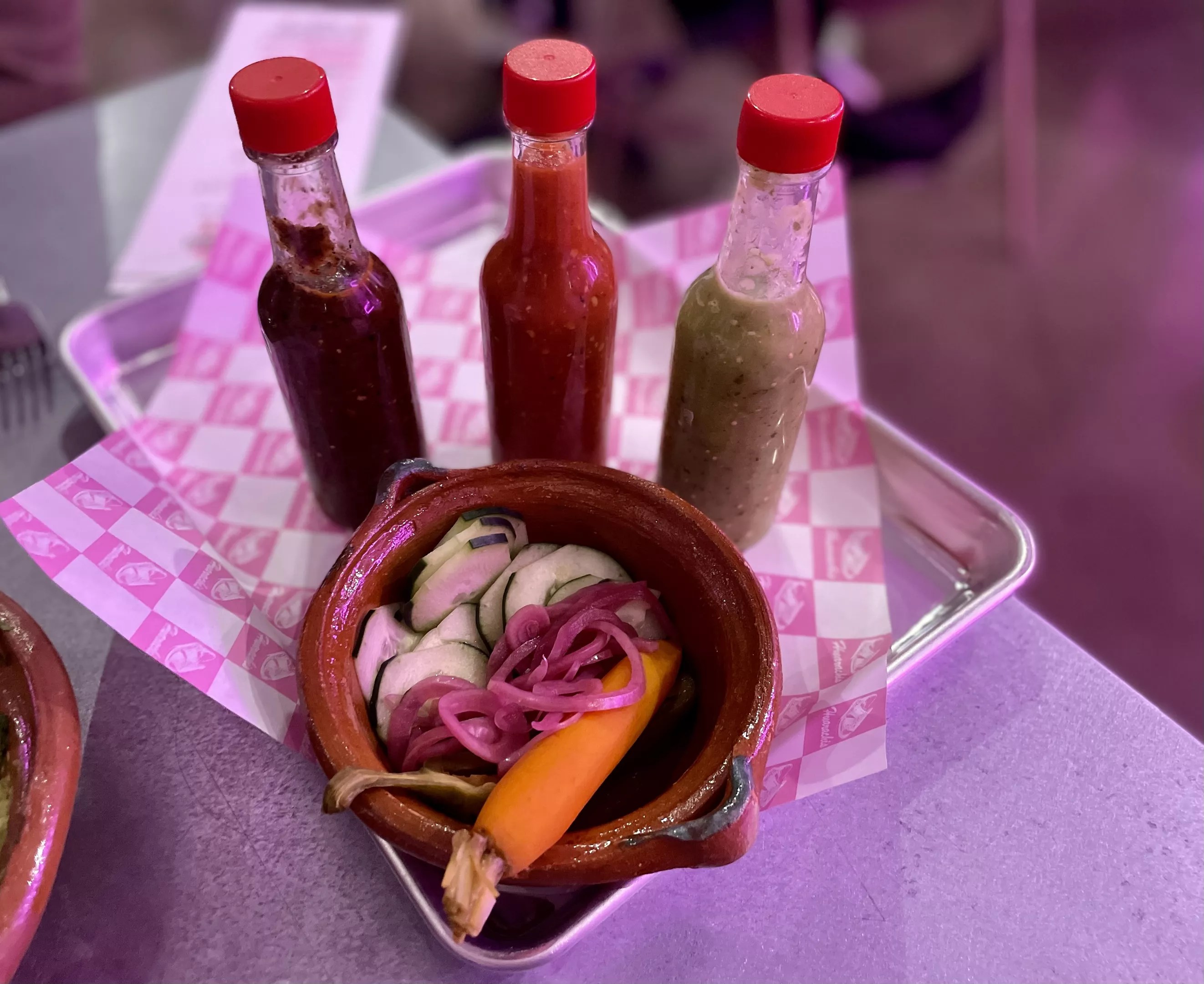 A selection of hot sauces and lightly pickled vegetables at Huarachis Taqueria.