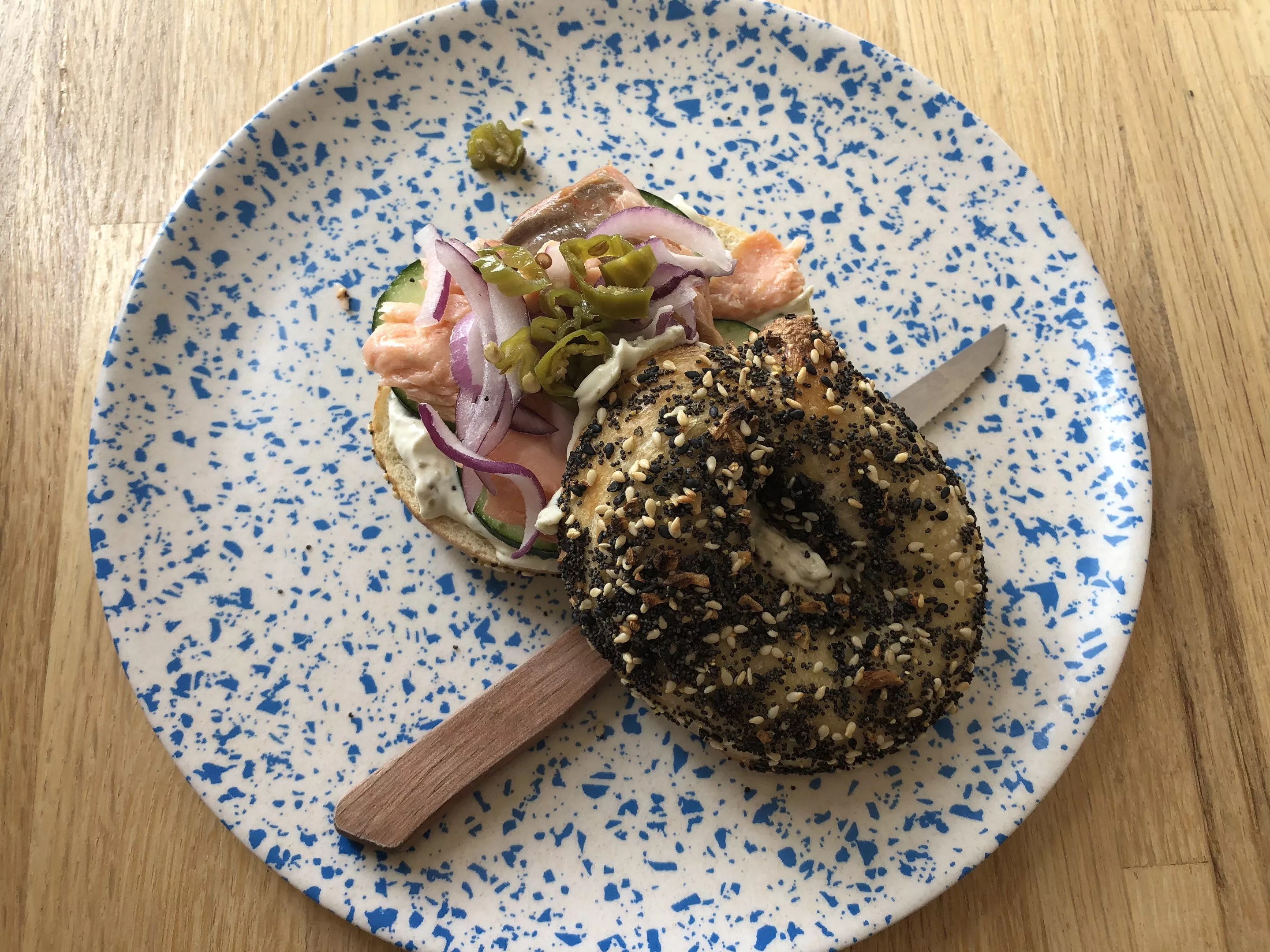 Velador adds nice touches. Her everything bagel has the usual seeds and bits of allium, but also black sesame seeds and Maldon sea salt. Her many schmears shame your standard xanthan gum cream cheese. Order right, and your bagel will come draped with Chula Seafood smoked salmon. Visually, the bagel is lean, with scant puffiness and an oval hole in the middle.