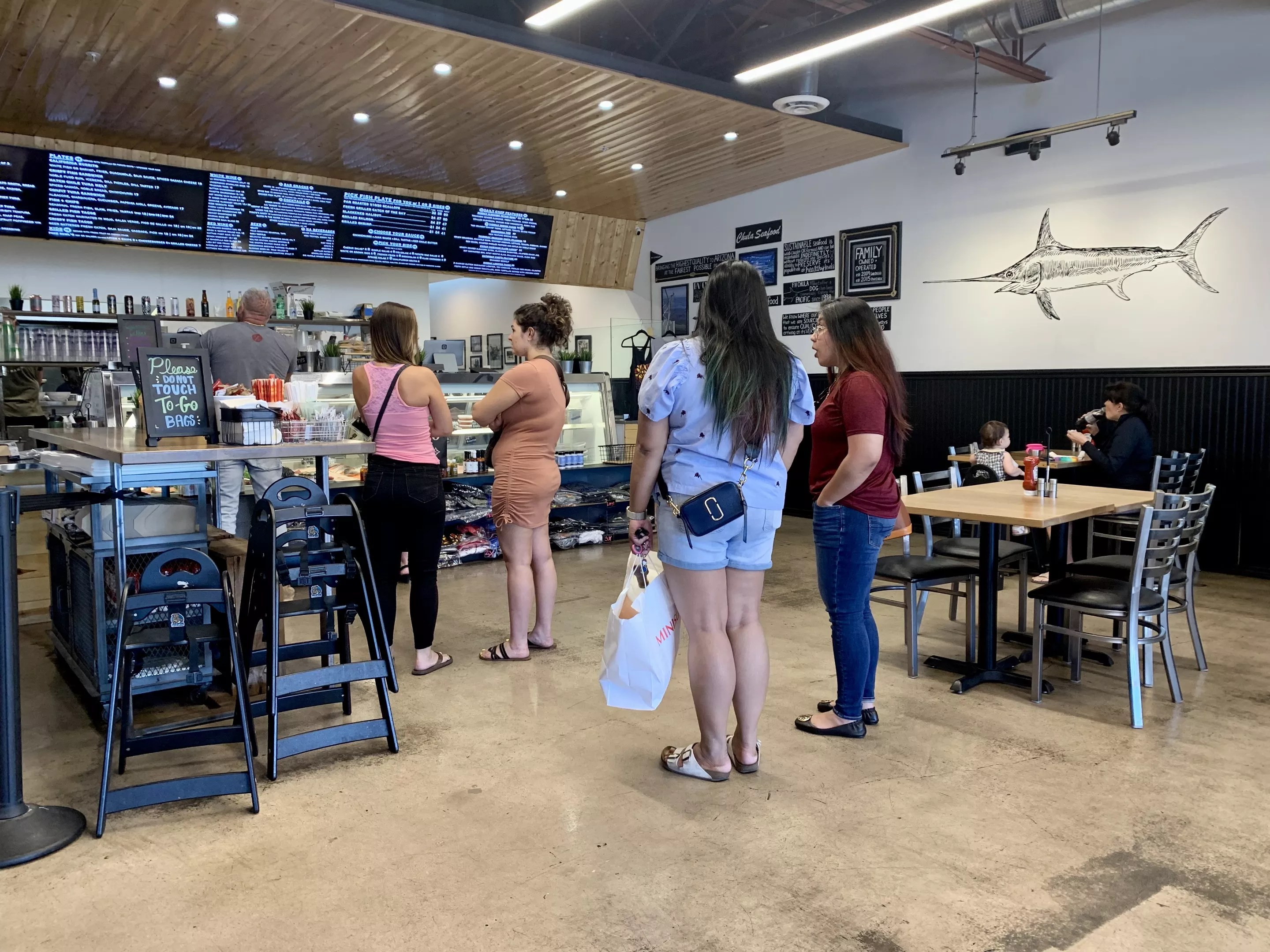 A line of customers waits to order lunch at Chula Seafood.