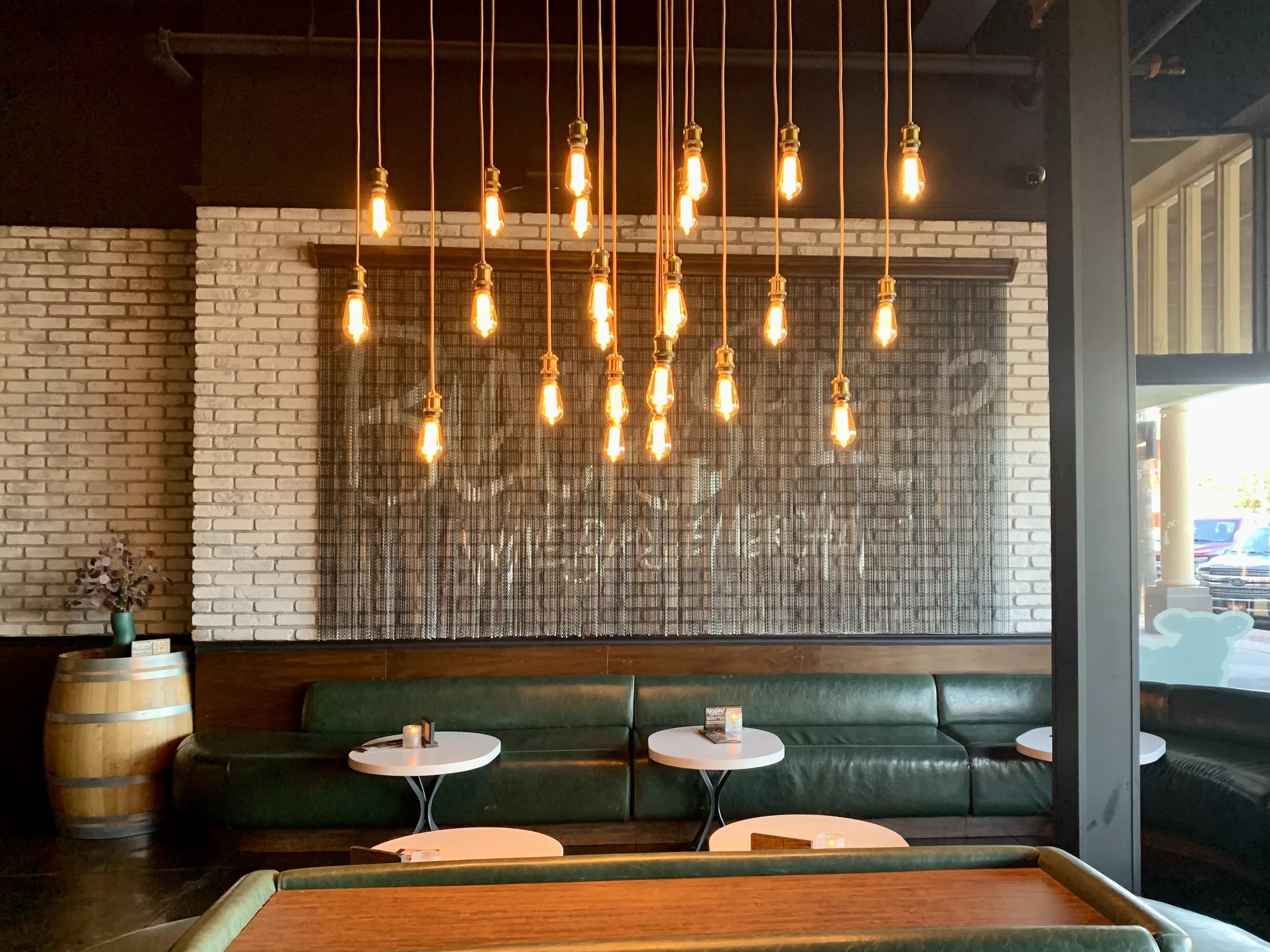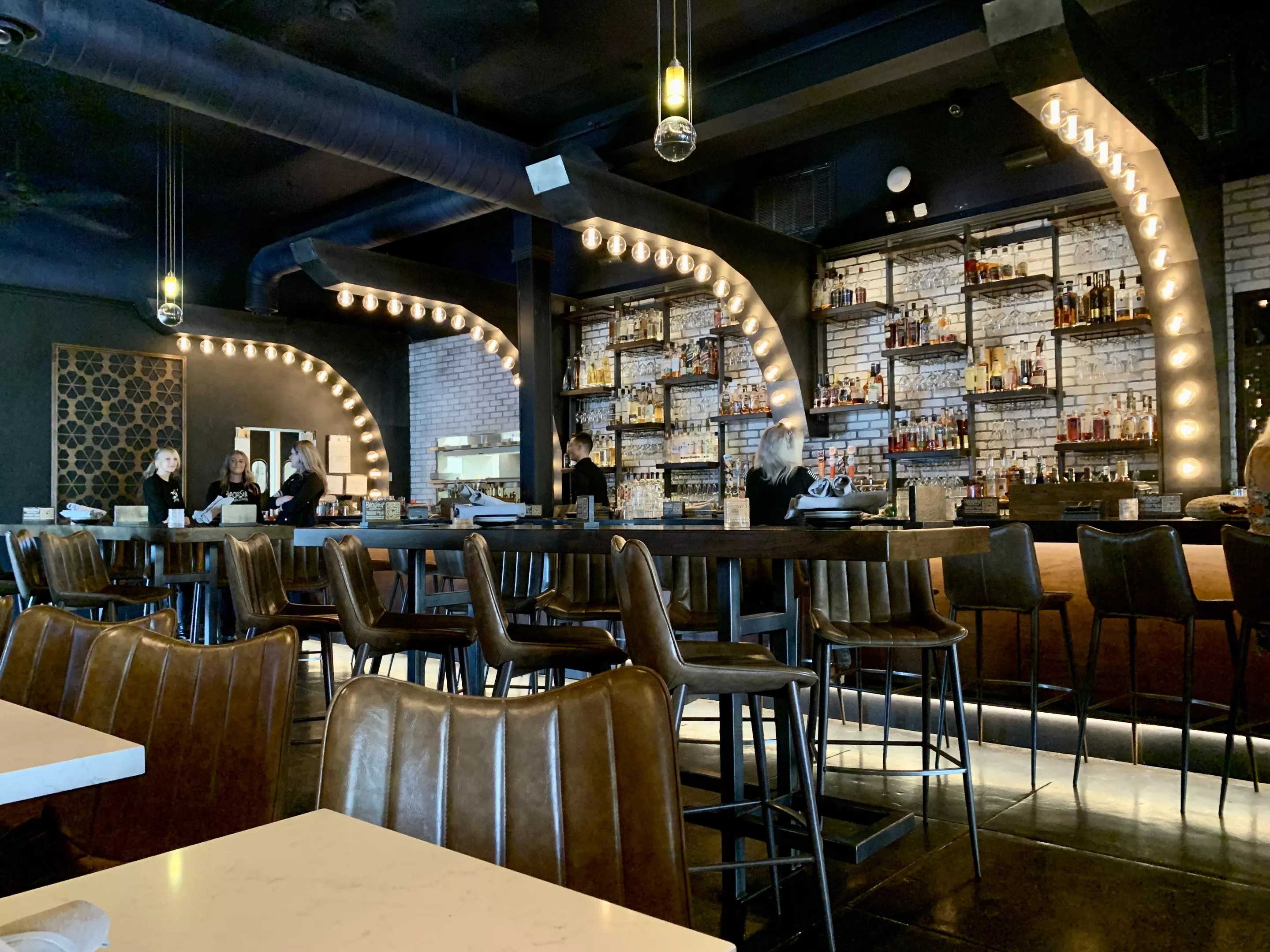 Oversize Edison bulbs cast a warm glow over the monochromatic bar at Blacksheep Wine Bar.