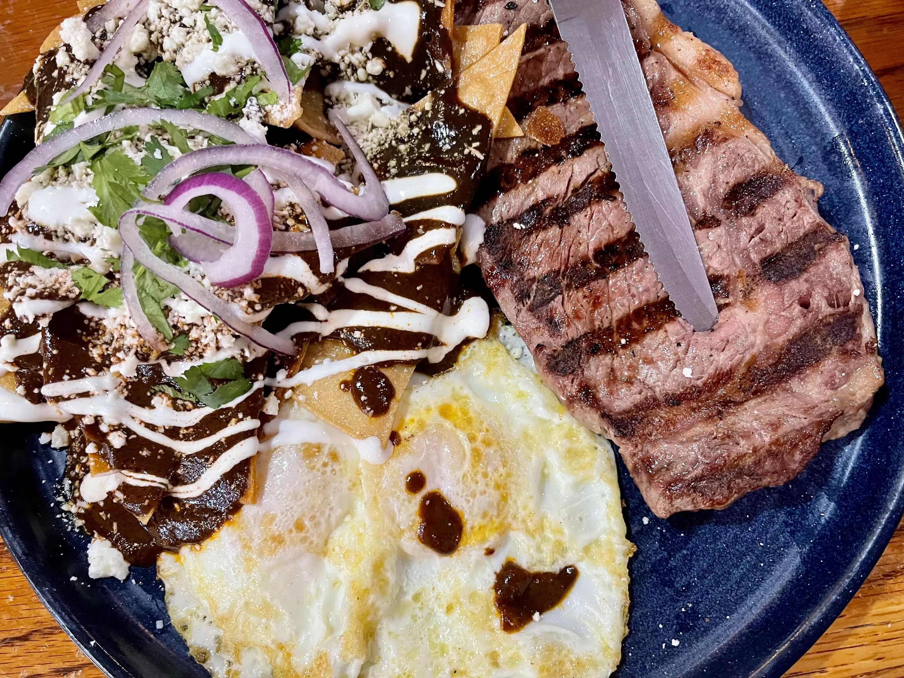 The Chilaquiles Divorciados is one of the signature dishes at Alebrijes. It includes a choice of steak and two eggs along with chilaquiles made with mole and homemade tortilla chips.