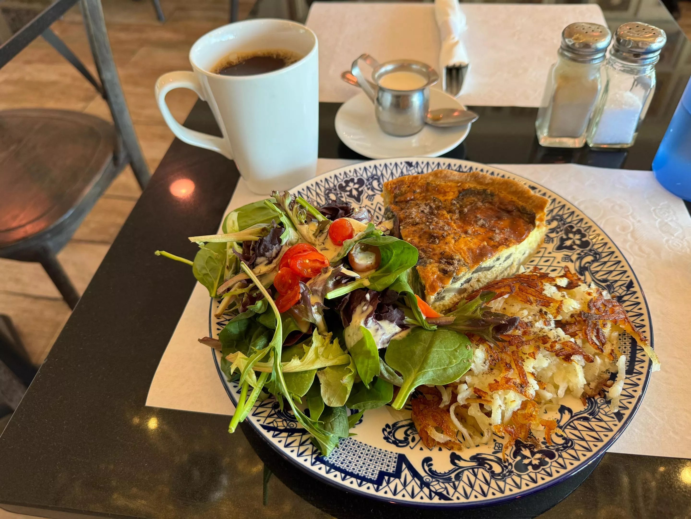 If sitting in the dappled shade while listening to a gently rippling fountain and singing birds sounds like an ideal way to start your day, head to Lon’s at the Hermosa Inn for a relaxing and serene brunch. There is plenty of seating inside the Old West-style restaurant, but the peaceful patio, filled with giant cactuses, towering olive trees and tables filled with friends and families, is the spot to be on Saturday and Sunday mornings. Follow your server to a shady spot with cream umbrellas and tablecloths and order a blood orange or peach mimosa to kick things off. Appetizers aren’t always a given at brunch, but they shouldn’t be missed at Lon’s. Try the sticky, sweet monkey bread or an order of oysters on the half shell. Main dishes include Southwest staples such as chilaquiles, huevos rancheros and pozole. A hint of the coast comes into play with lobster or salmon Benedicts and shrimp tacos. Bright and fresh, the food matches the colors and feel of the gorgeous patio environment. Truffle mushroom quiche at Merci French Cafe. Sara Crocker