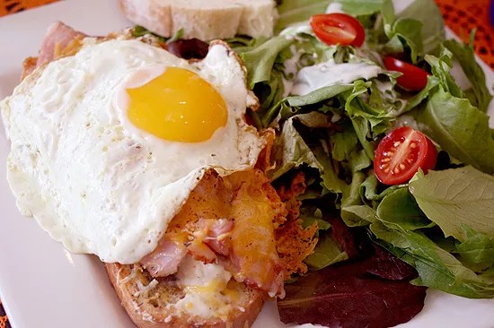 Merci French Cafe offers a savory ham and cheese crepe topped with an egg.