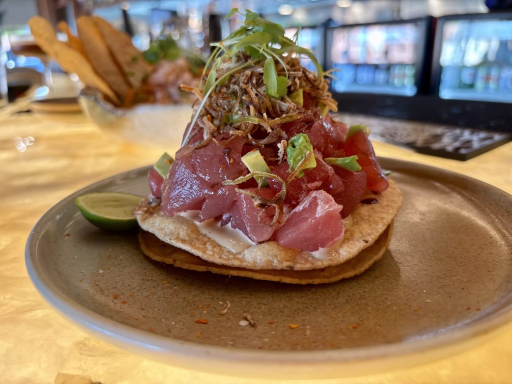 The Yellowtail Tostada at Marisco Boys is piled high with fresh fish.