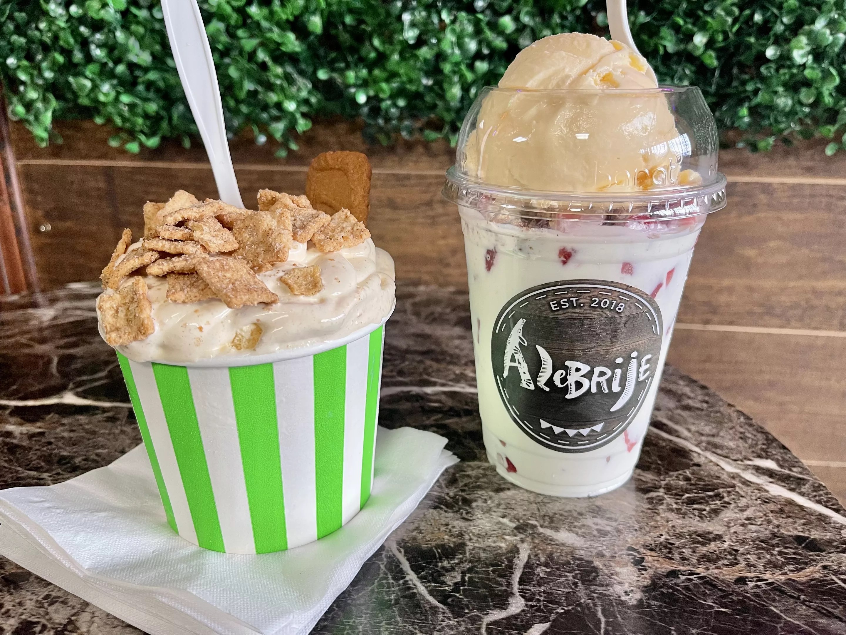 Alebrije Neveria serves a selection of treats, including fresas con crema (right) and cereal-infused ice cream (left).