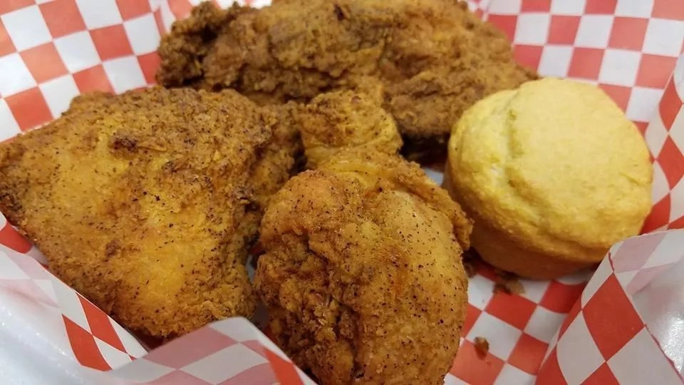 Off da Hook was, I thought, the hands-down winner of our fried chicken pageant. The thick, crusty breading on both the drumstick and the breast was perfectly Cajun-spiced with hints of cayenne and paprika. Carolyn found Off da Hook’s breading too salty, though she appreciated how crisp it was and thought that visually it looked like the most perfect fried chicken ever made.