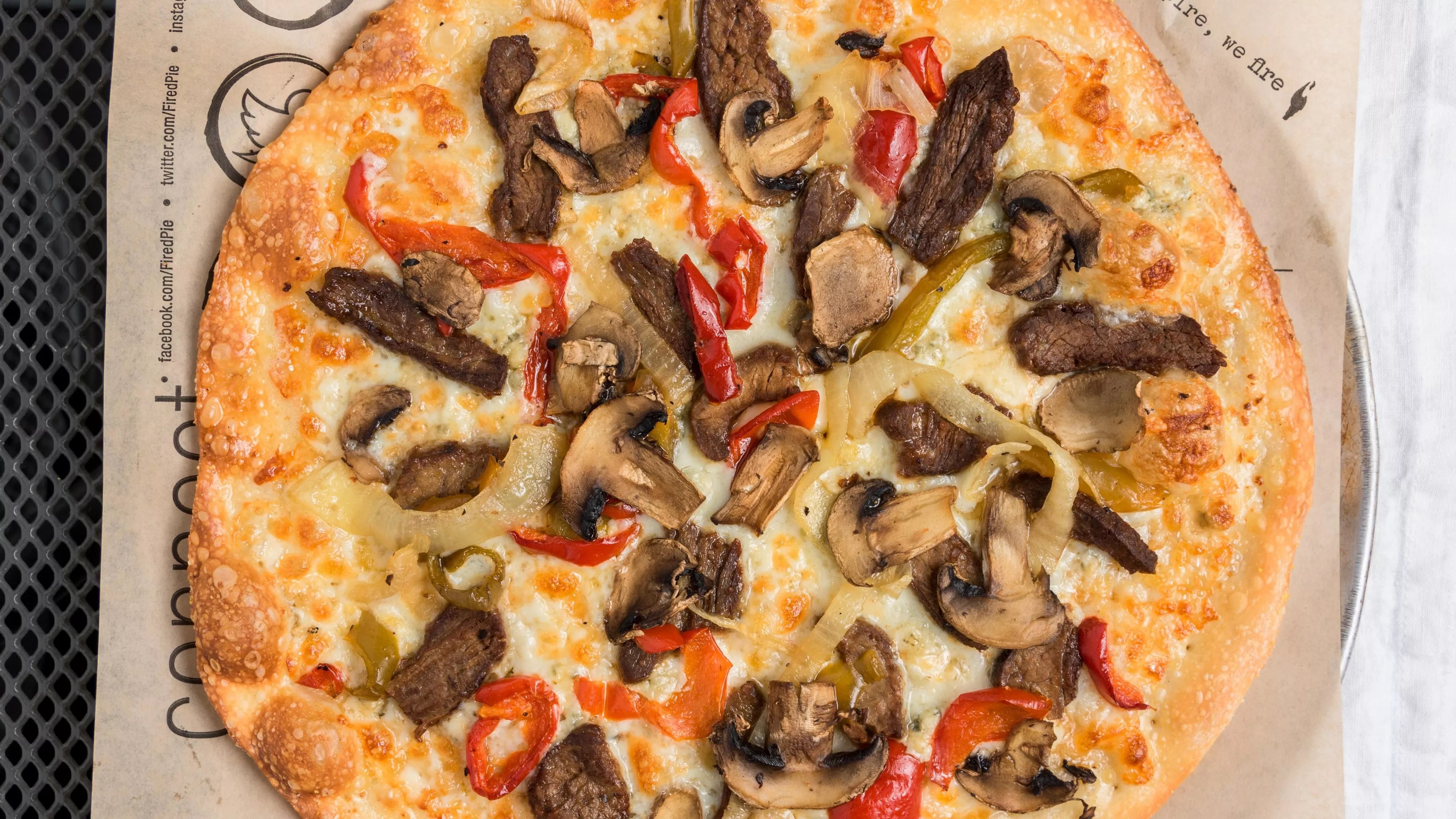 When you bite into the Steak and Blue Pizza at Fired Pie, it bites back. That would be the gorgonzola, a pungent Italian cheese made from unskimmed cow’s milk that has salty sass running through its blue veins. The way the cheese interacts with the rest of the Steak and Blue’s ingredients – garlic, oil, mozzarella, mushrooms, peppers, onion, and thin-sliced steak – doesn’t change much about its dirty-foot aroma. Against these odds, though, this Fired Pie pie tastes amazing. We recommend it for a solo outing, though. Maybe not great for date night.