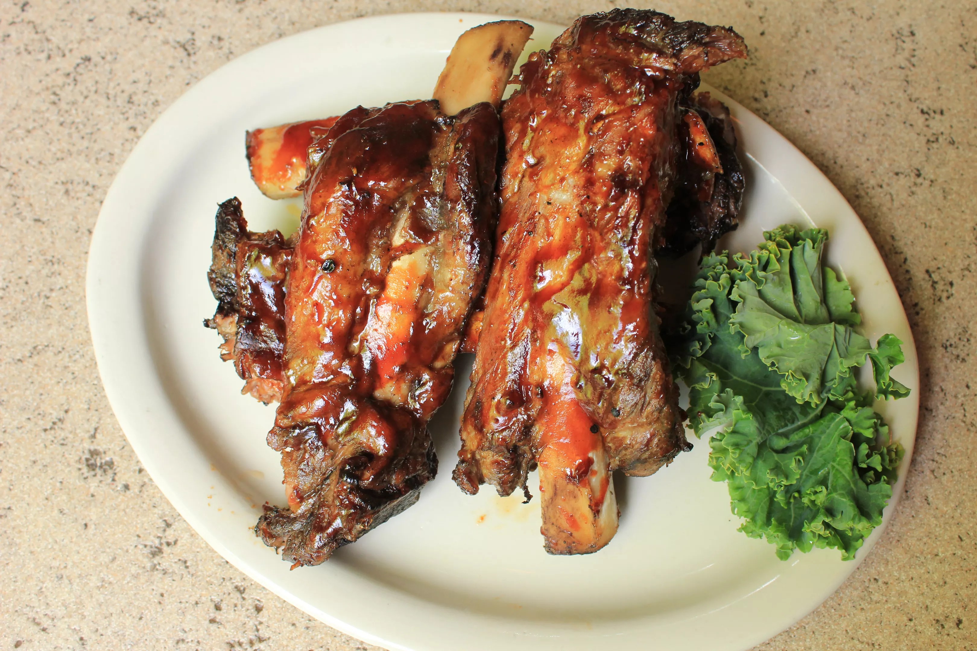 Hittle leaves beef ribs on the rack until an order. Then, he cuts them off bone by bone. You get four bones per order. Each looks like the femur of a stegosaurus.