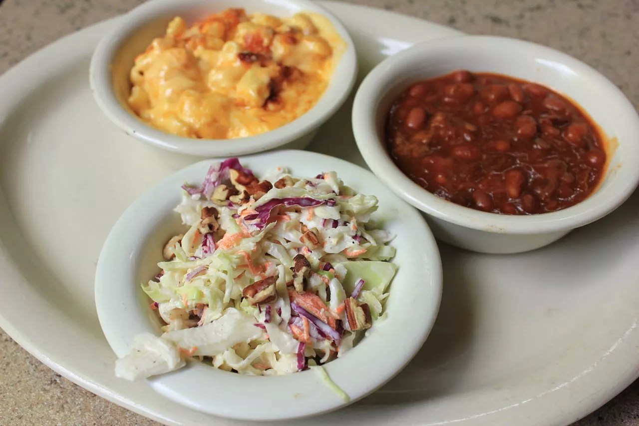 Sides are homestyle, satisfying, typical. Mac and cheese has more cheese than mac. A nice coleslaw has the small crunch of pecan pieces. Barbecue beans teeter dangerously toward the sweet side and, in their soupy saucer, show shreds of leftover barbecue meats.